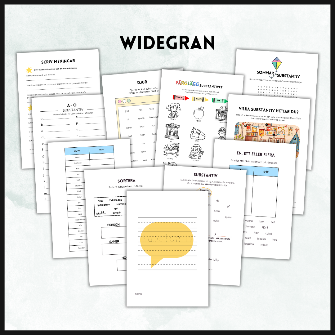 Arbetshäfte med substantiv. 5 sidor. Identifiera substantiv. En, ett, flera. Skriva meningar.