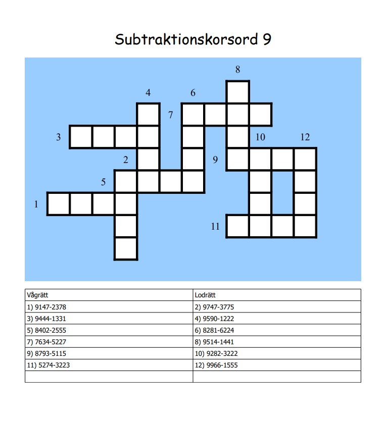 Korsord med subtraktioner Lös subtraktionen och skriv in talet. Facit inkluderat. pdf-format
