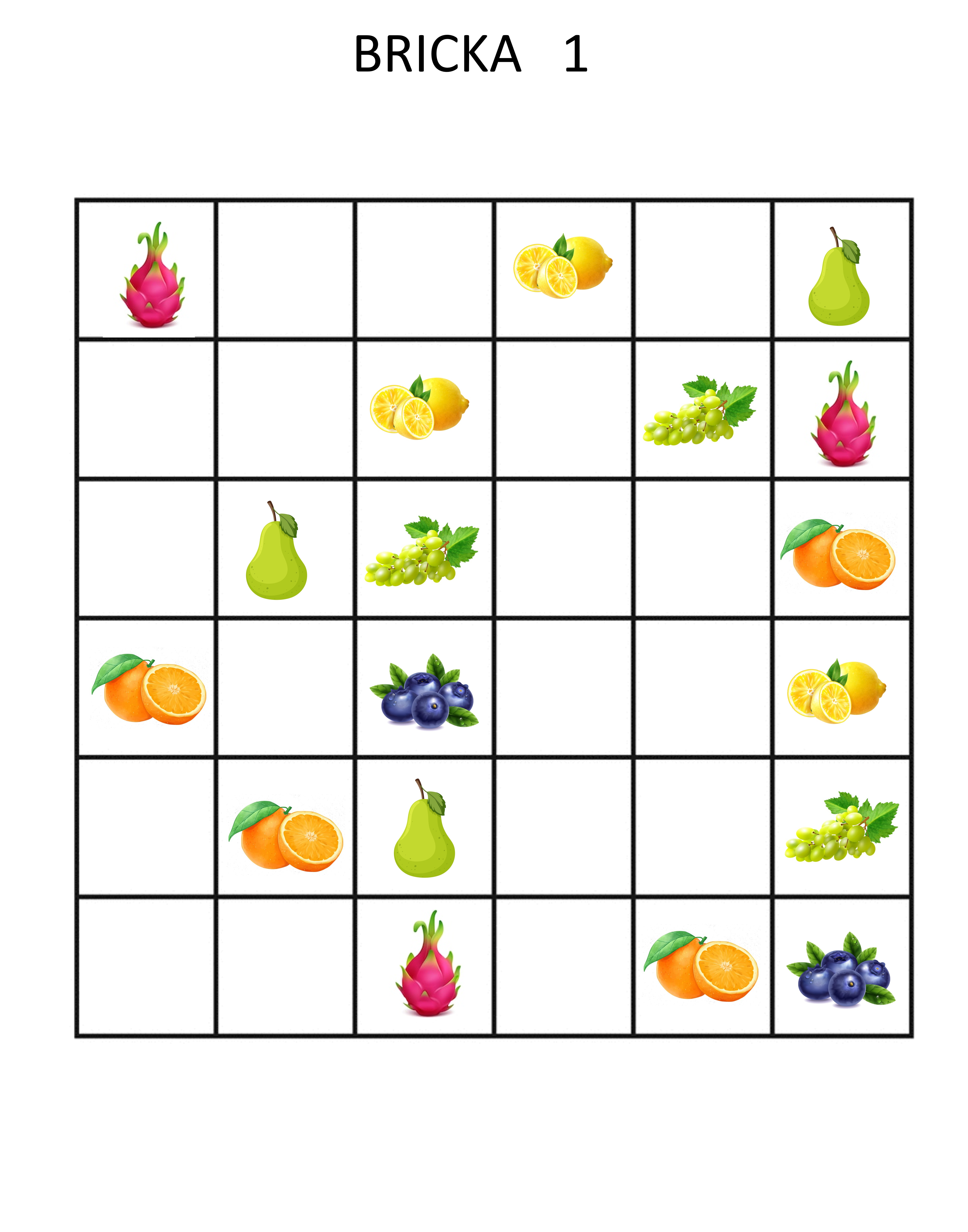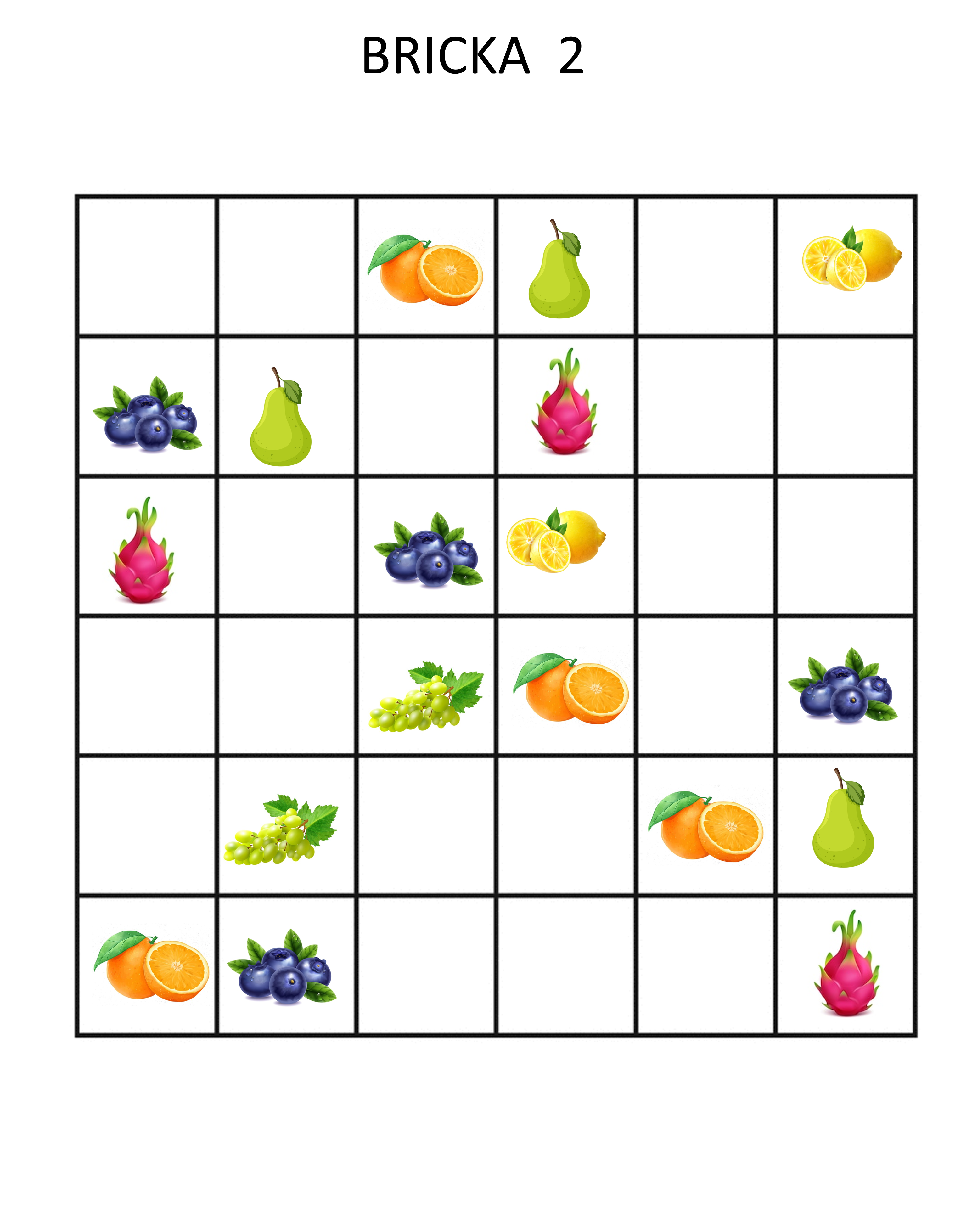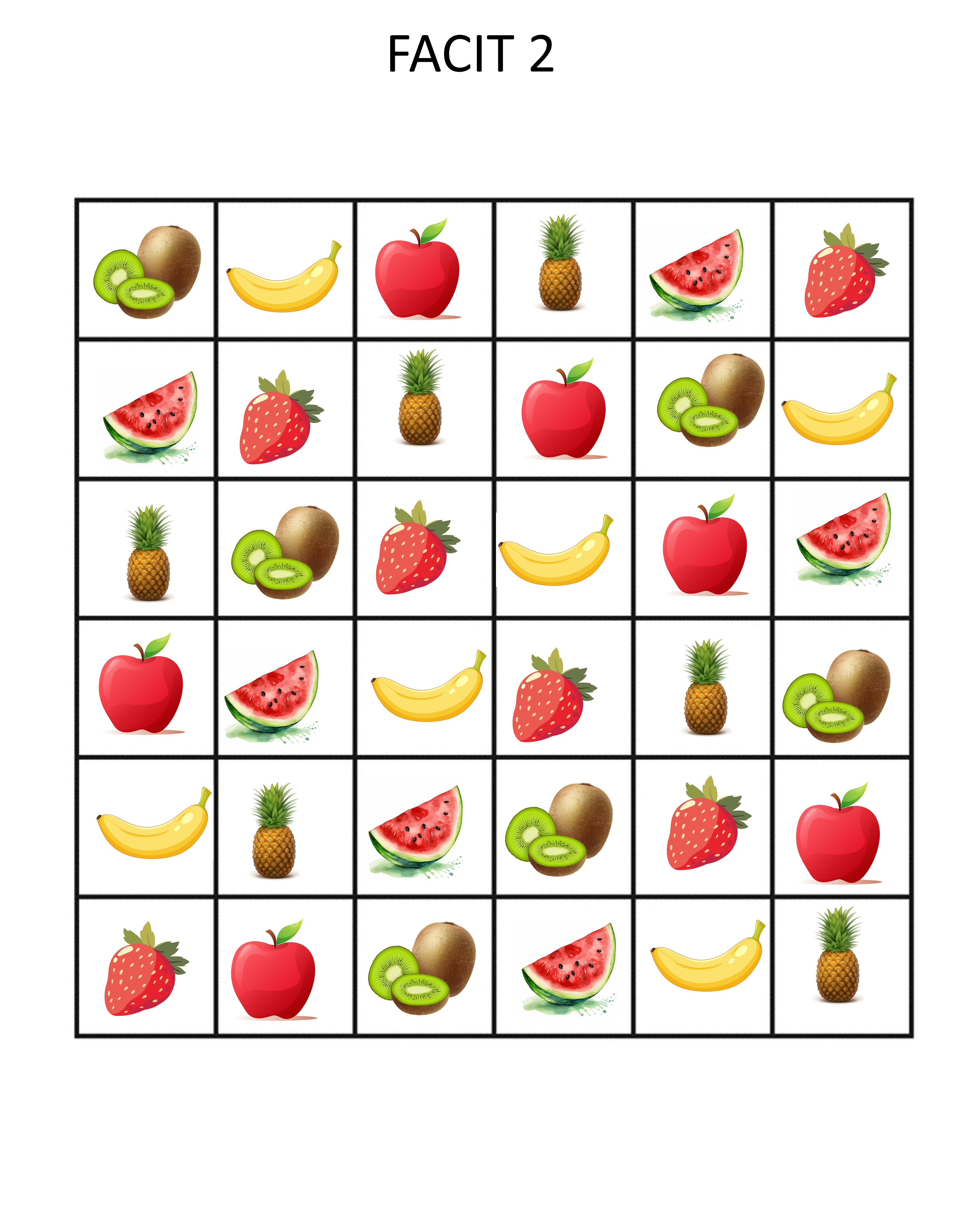 Materialet innehåller 7 brickor och 7 facit samt 72 fruktkort.