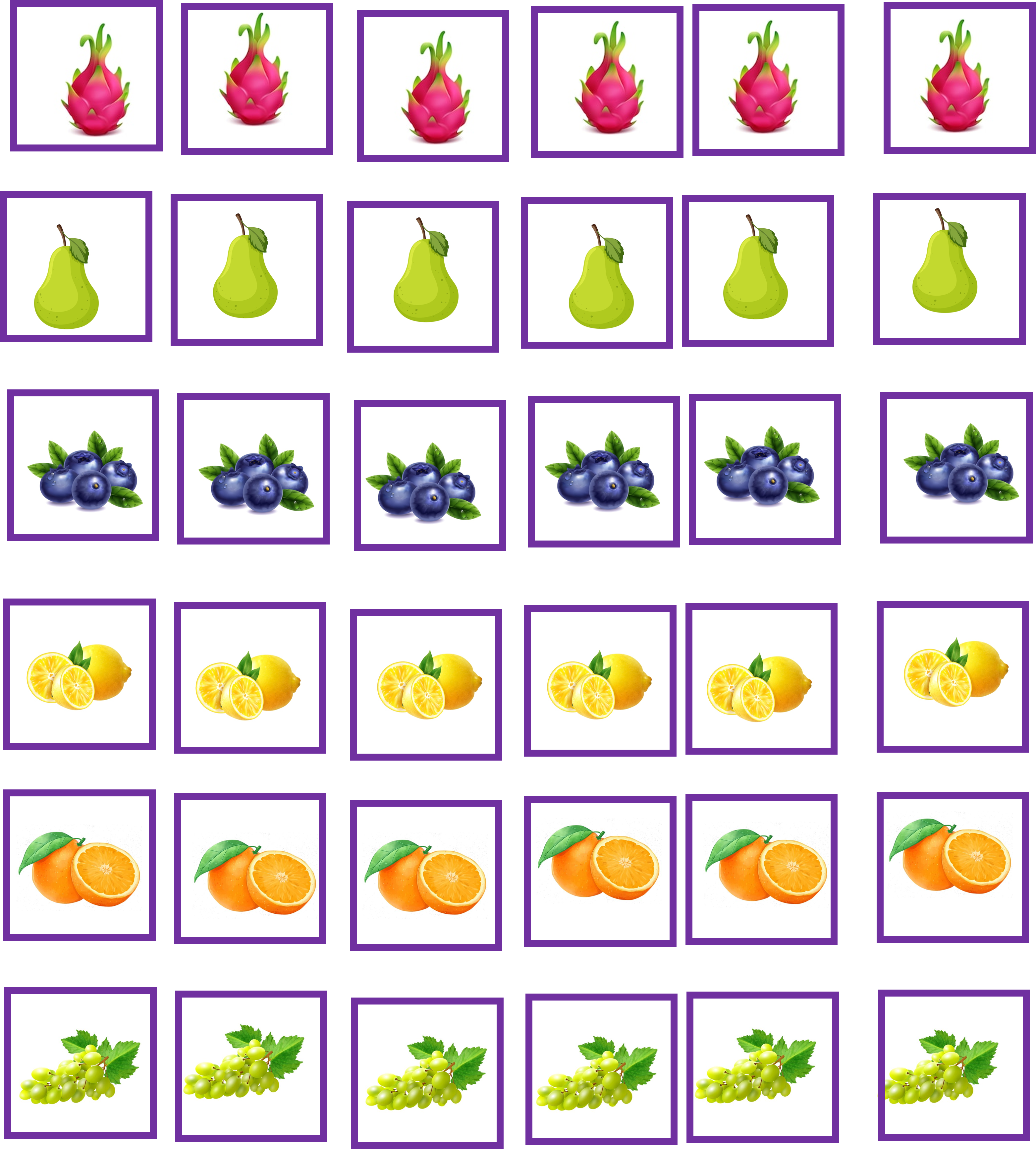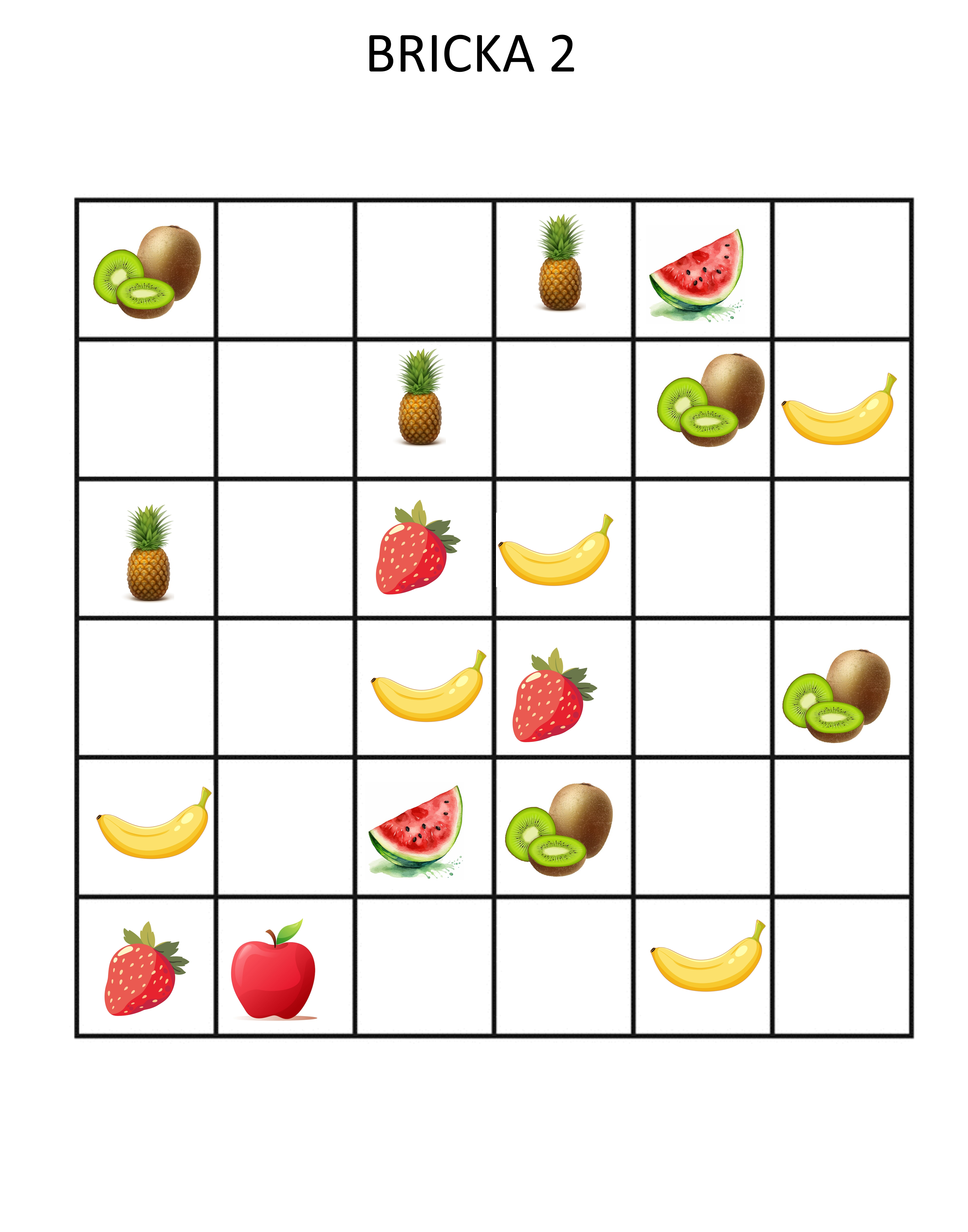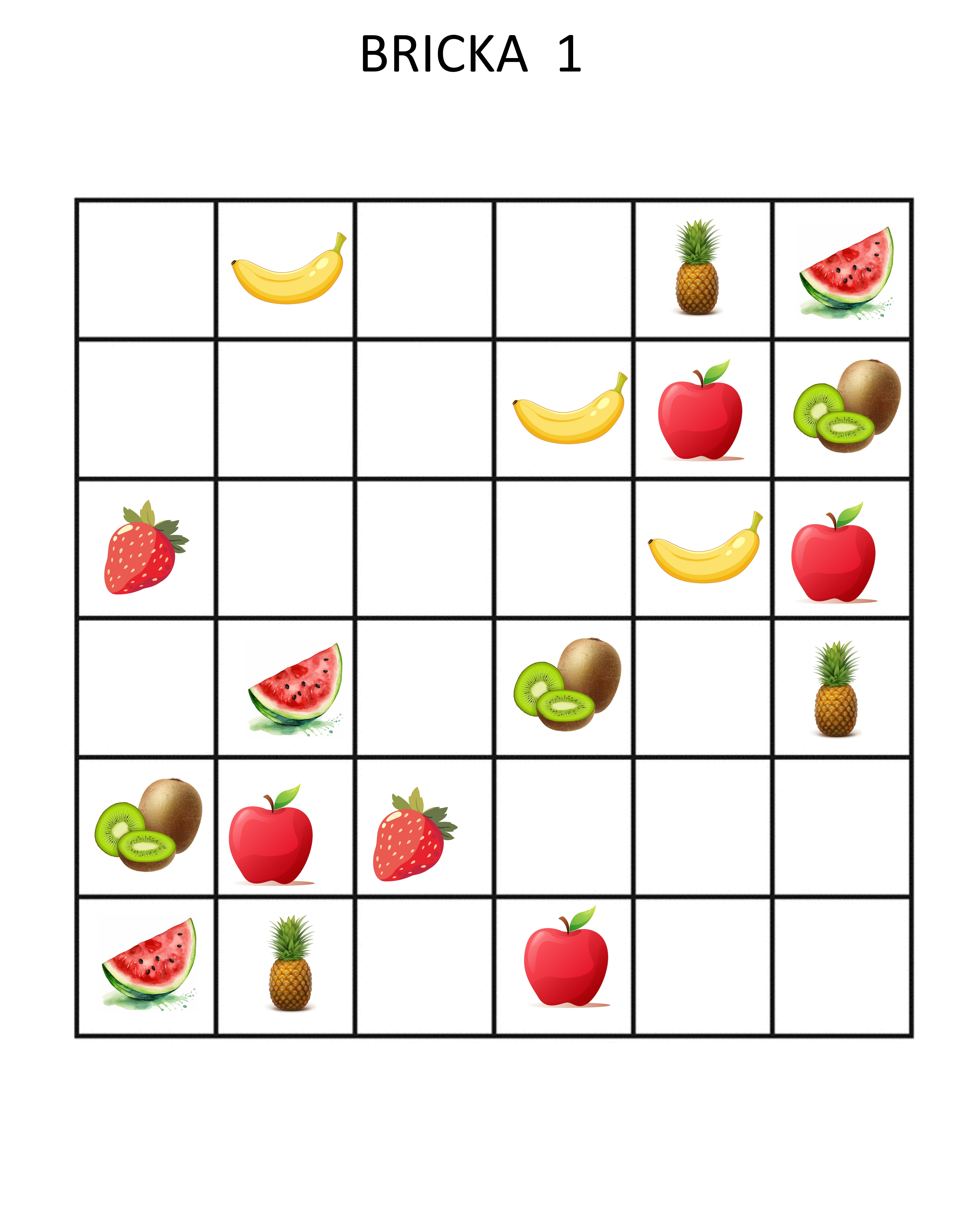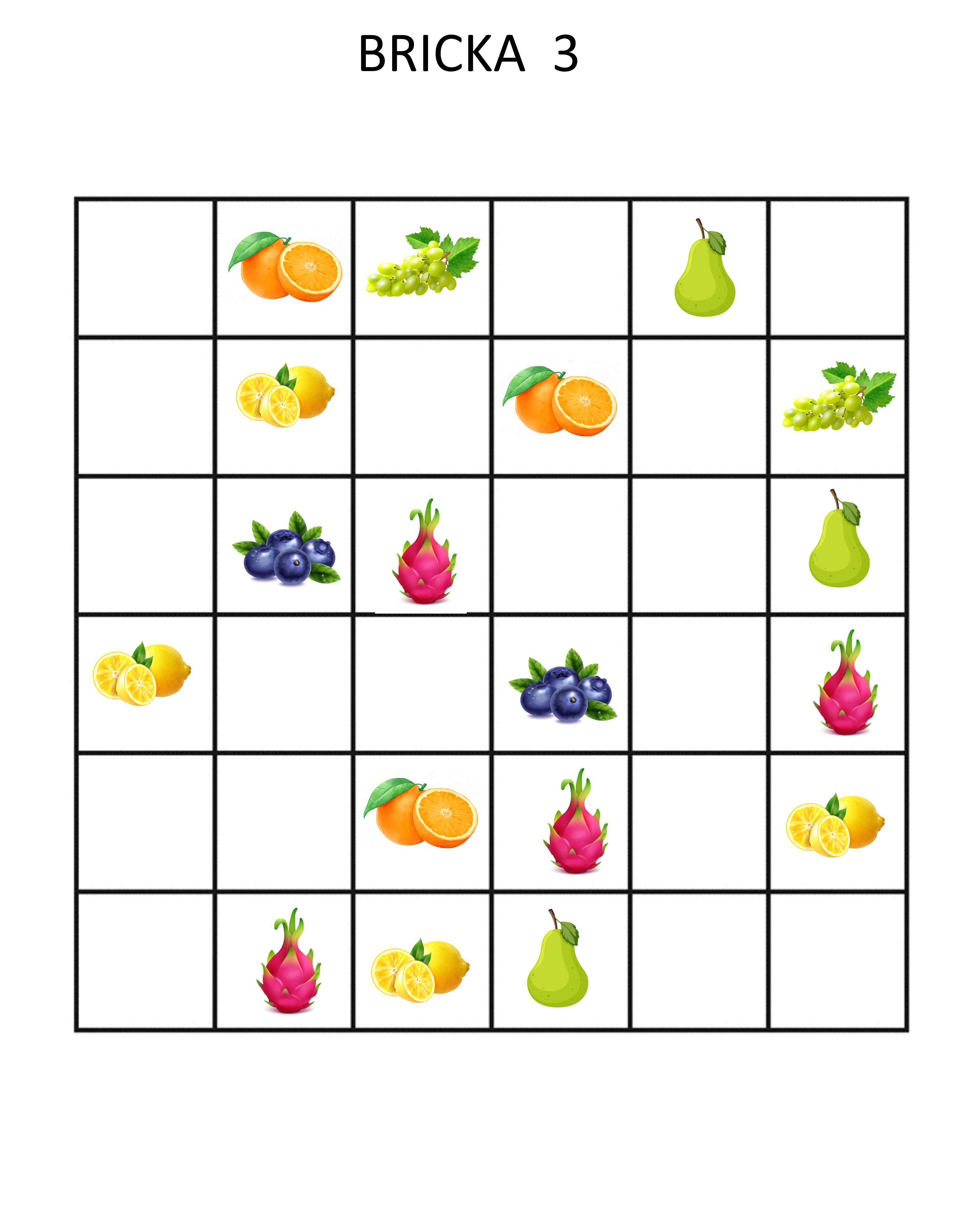 Materialet innehåller 7 brickor och 7 facit samt 72 fruktkort.