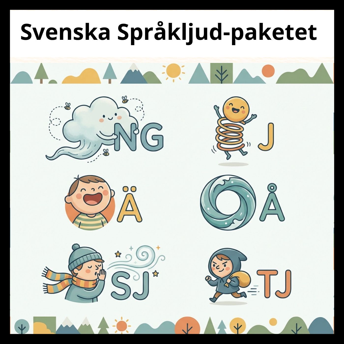 Detta språkljudspaket är ett elevvänligt och pedagogiskt material som fokuserar på sex viktiga språkljud i svenska: ng-ljudet, j-ljudet, ä-ljudet, å-ljudet, sj-ljudet och tj-ljudet. Paketet är utformat för att stödja elever i förskoleklass och lågstadiet, samt för elever som behöver extra träning i uttal, fonologisk medvetenhet och språklig säkerhet.