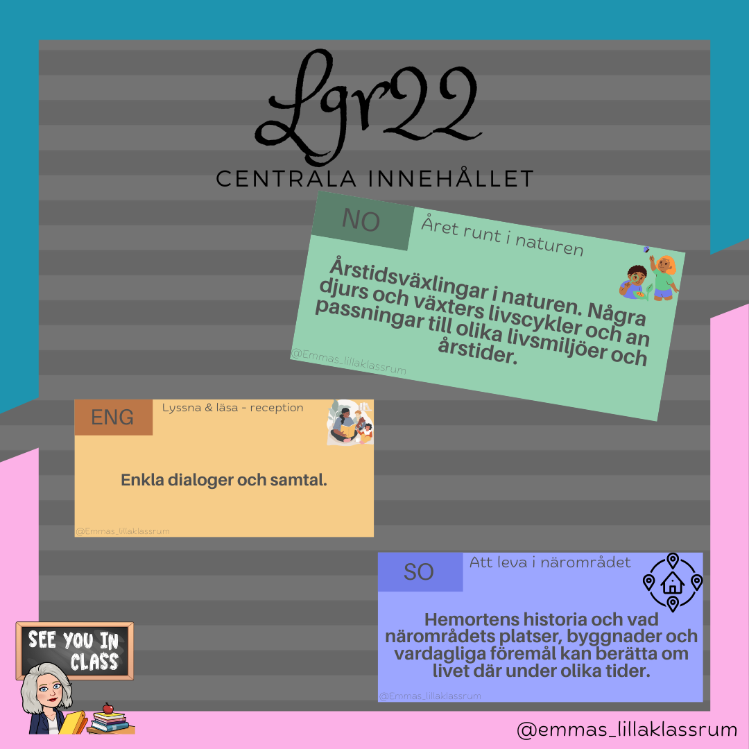 Materialet består av kort med den centrala innehållet. Ett centralt innehåll per kort. Man kan använda materialet för att synliggöra det centrala innehållet för eleverna, så att de vet vad lektionen ska lära. Eller använd de så som de passar din klass.