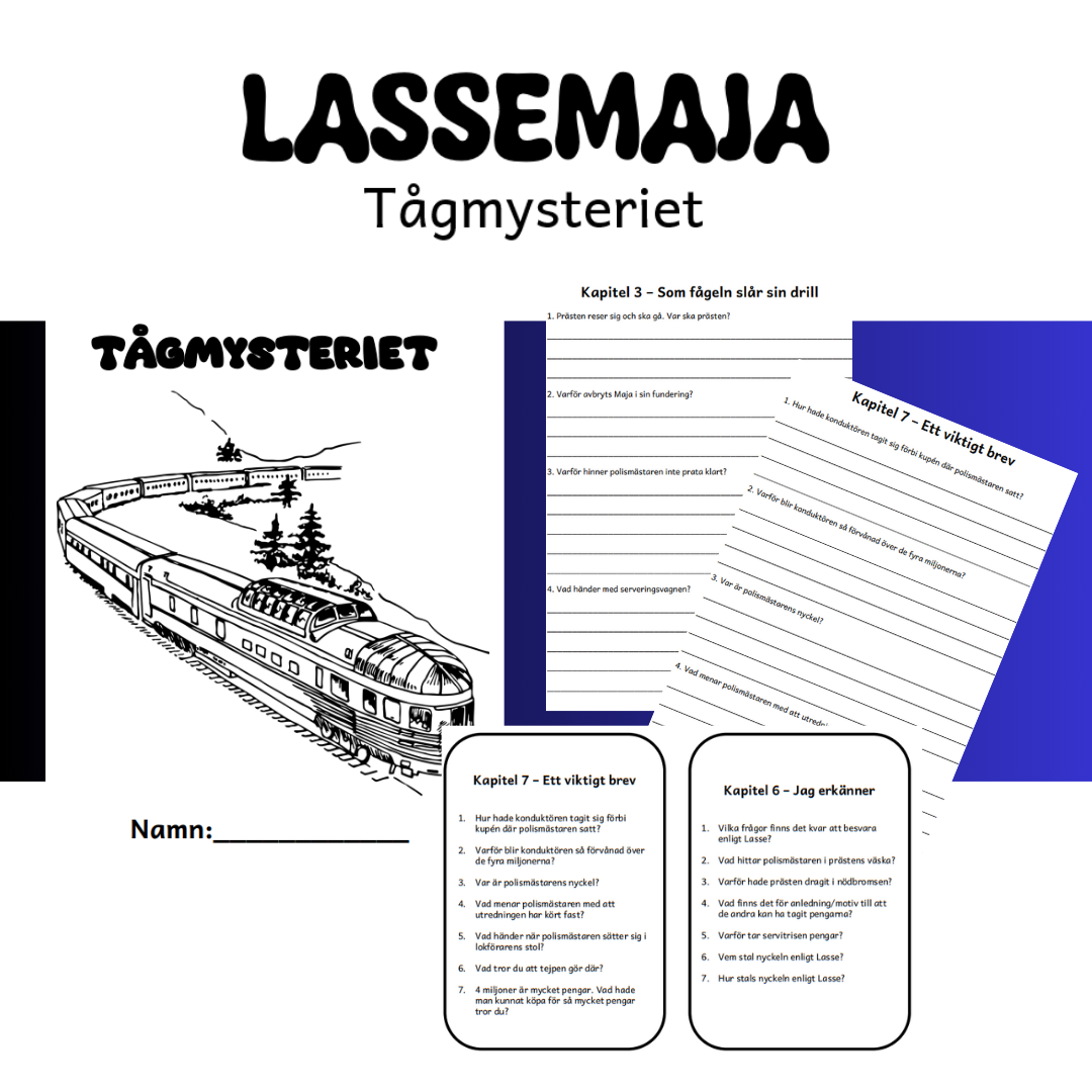 Läsförståelsefrågor till Tågmysteriet. I materialet finns det ett häfte med 7 frågor till varje kapitel. Använd materialet för enskild läsning, gruppläsning eller varför inte högläsning och diskutera frågorna i helklass. Det finns också möjlighet att skriva ut och laminera frågorna och sätta alla frågor till kapitlet med framsidan i en nyckelring.