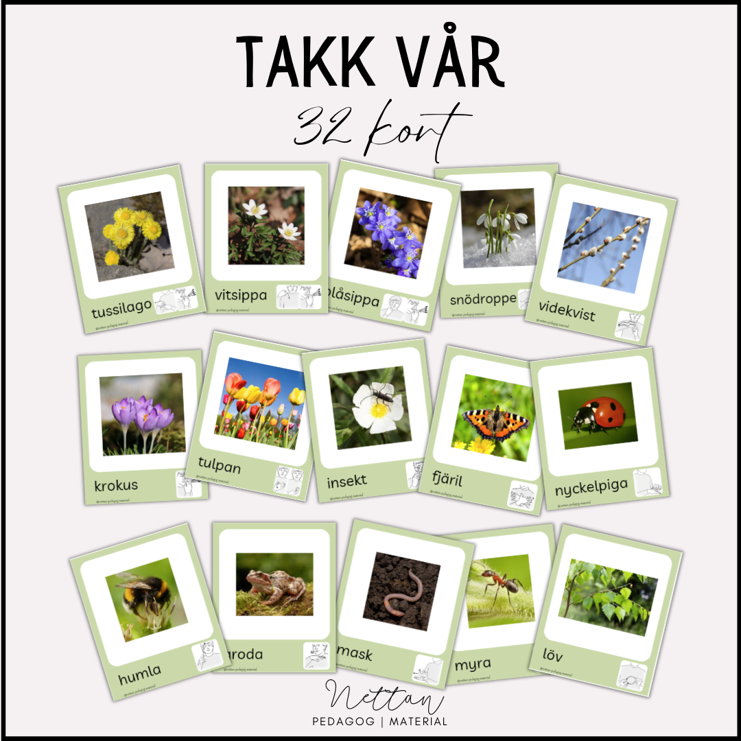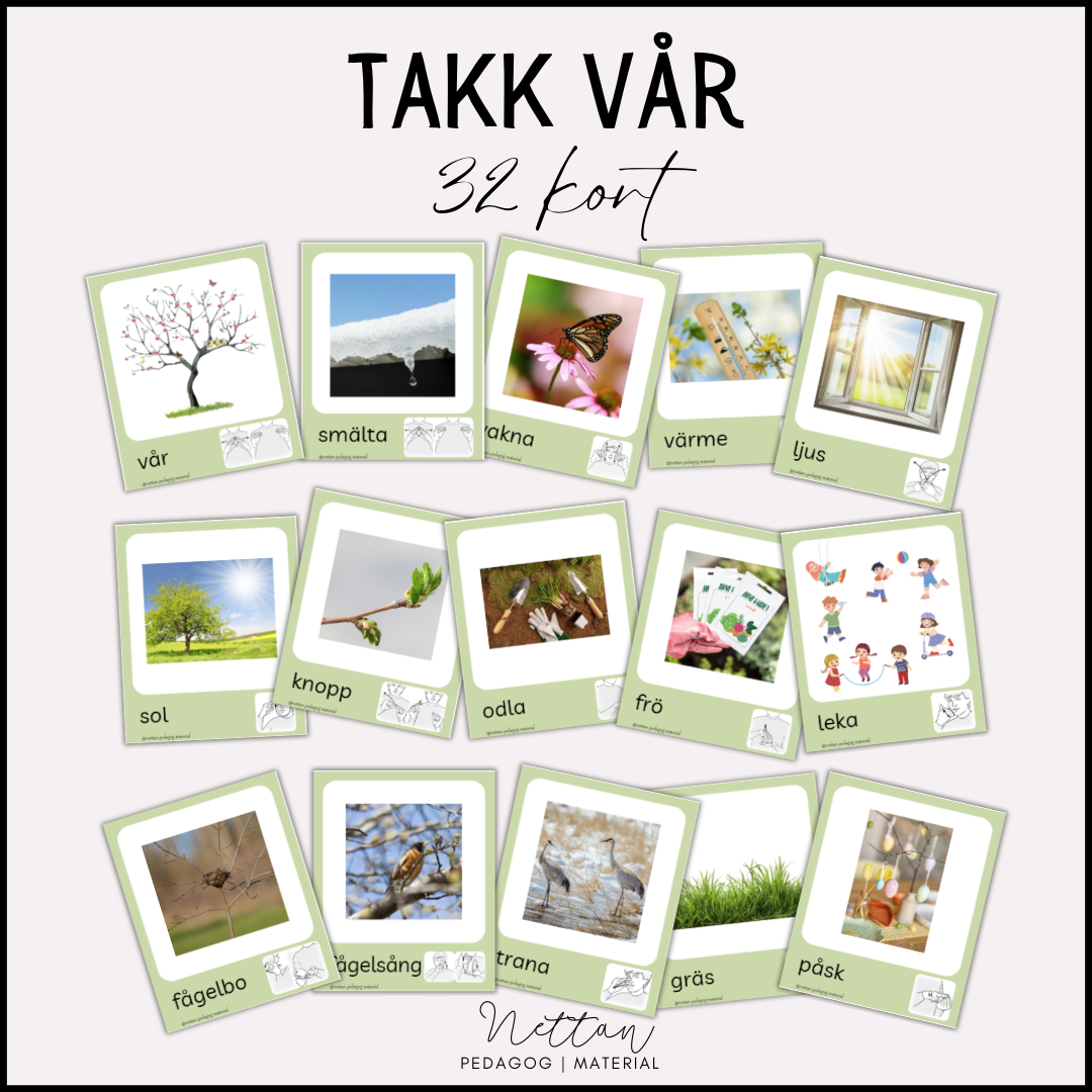 32 kort med begrepp, bilder och TAKK på tema vår.