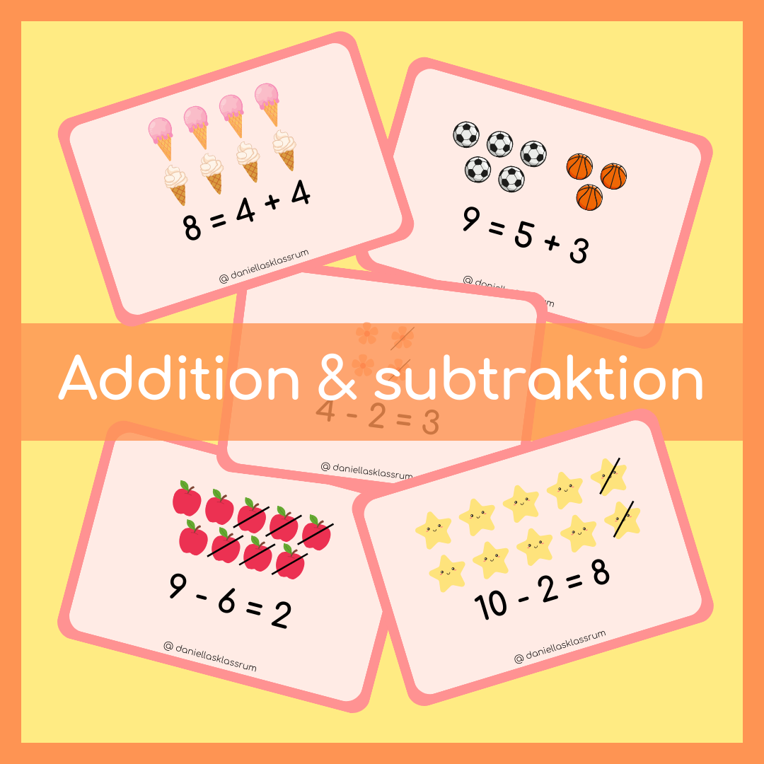 - 16 uttryck med addition och subtraktion som är sanna, 2 st varianter. 8 st med bildstöd, 8 st utan bildstöd.