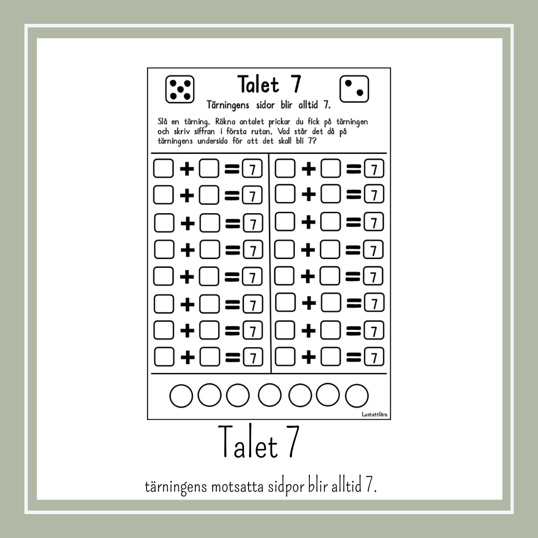 Här är ett där man får öva på talet 7. Slå en tärning skriv antalet prickar i den första rutan och skriv sedan vad som adderas med den siffran för att det skall bli 7. Vänd sedan på tärningen och se om du har rätt.