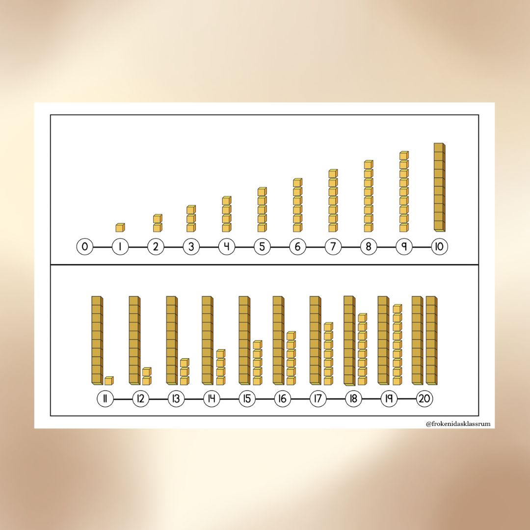 Tallinje 0-20 med visuellt stöd i form av entalskuber och tiotalsstaplar.