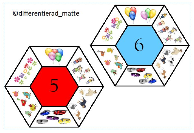 Eleverna tränar antalsuppfattning för talet 1 – 10. Placera bilder med runt hexagonen som har samma antal som talet i mitten.