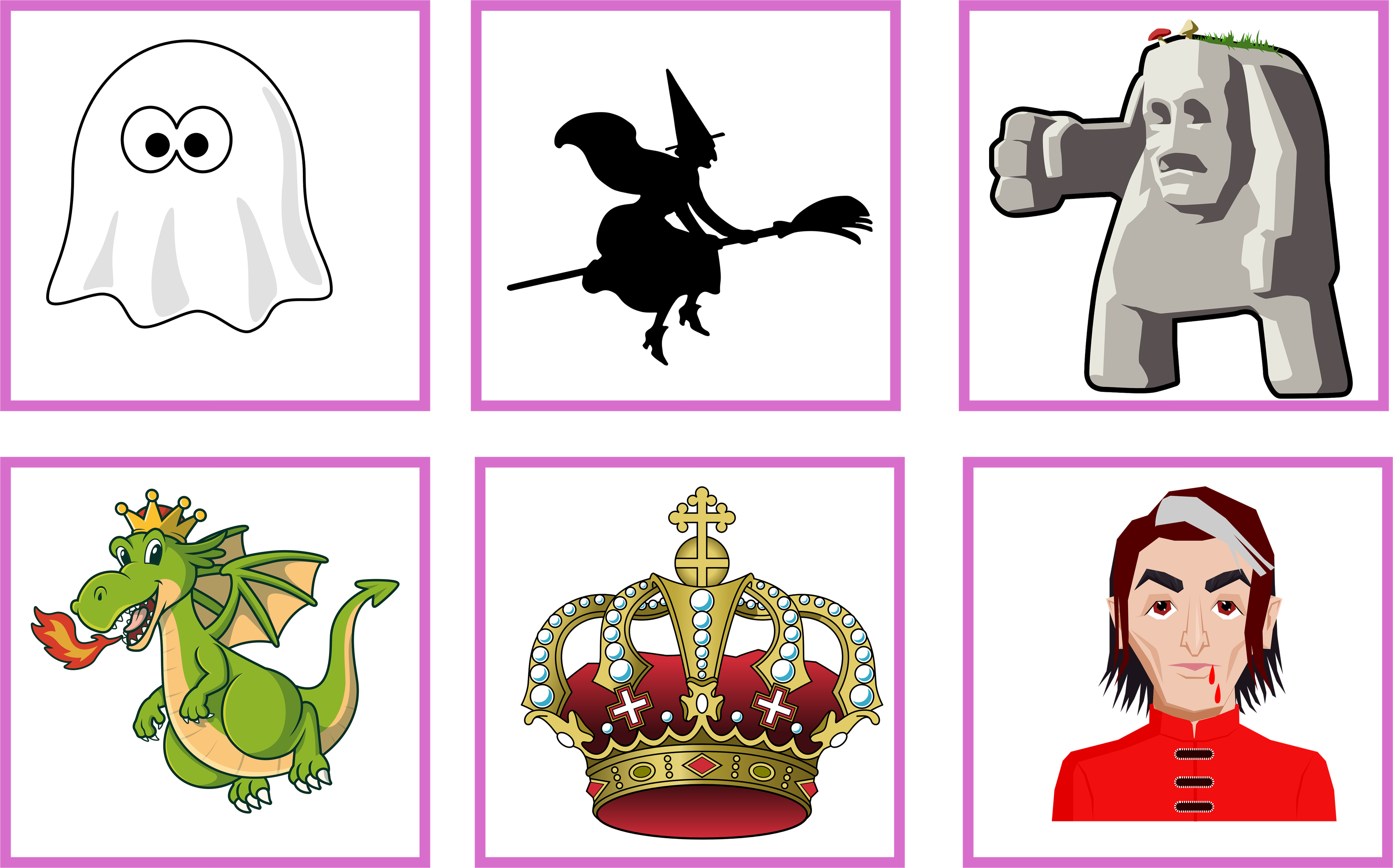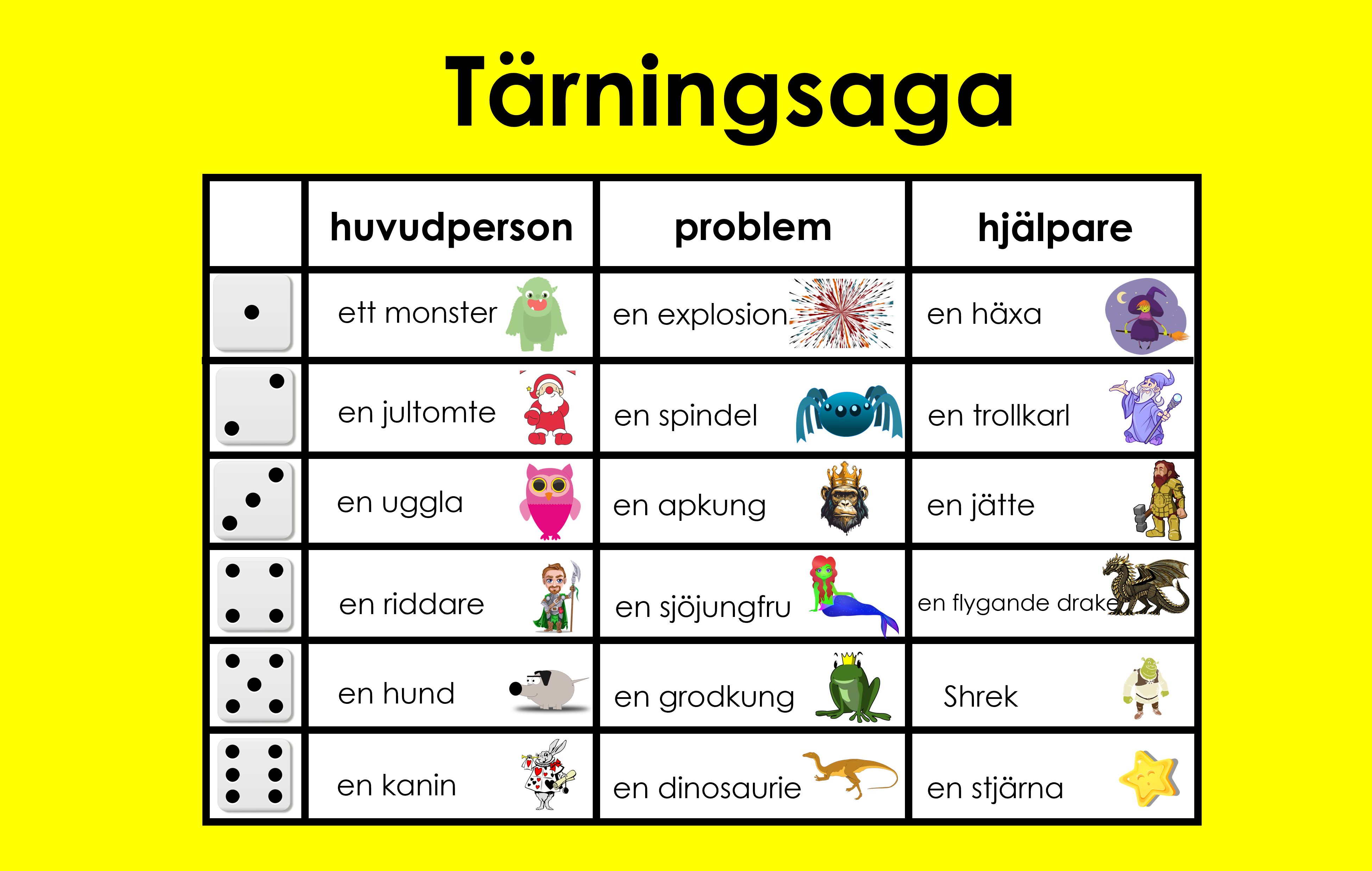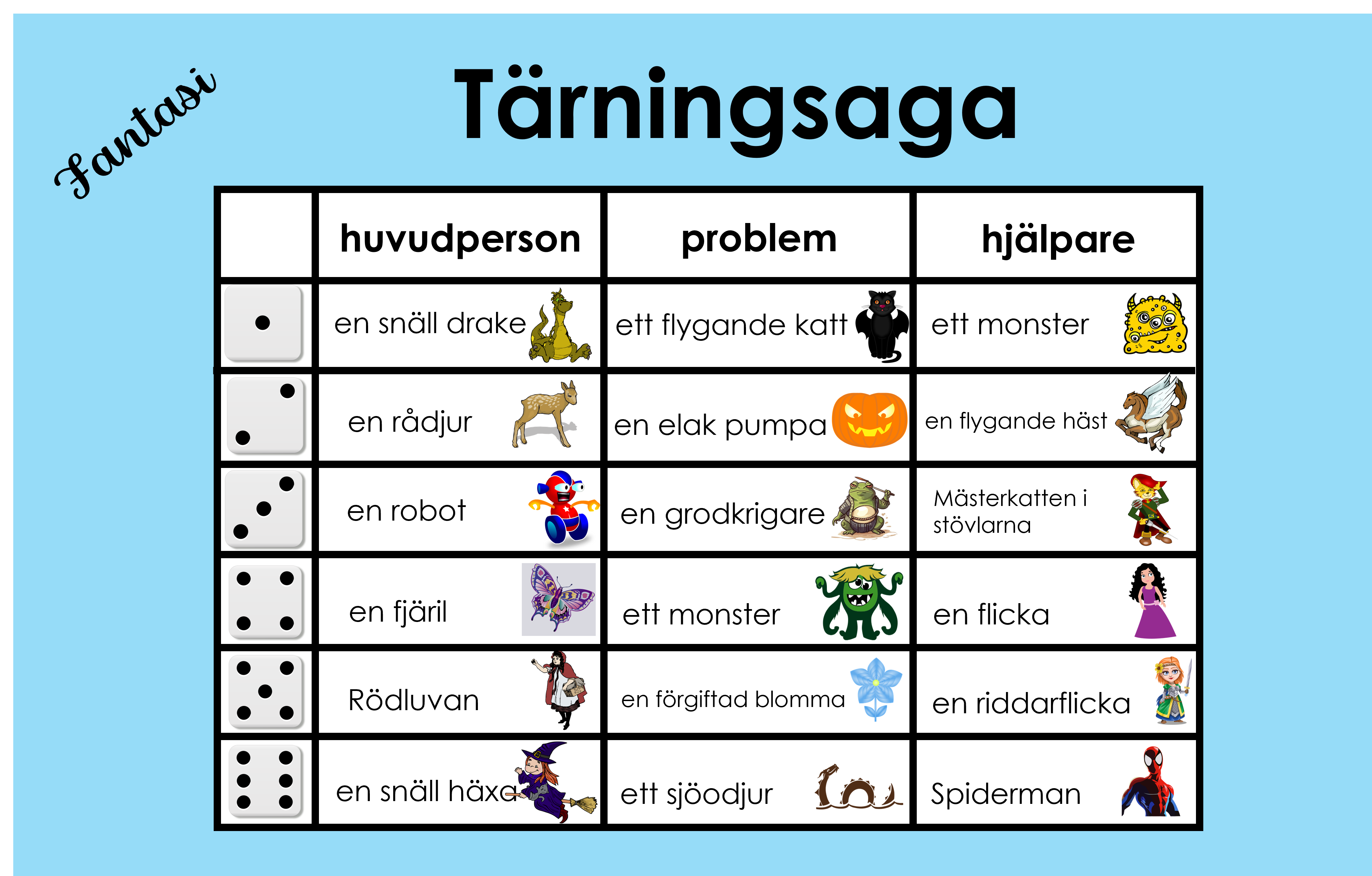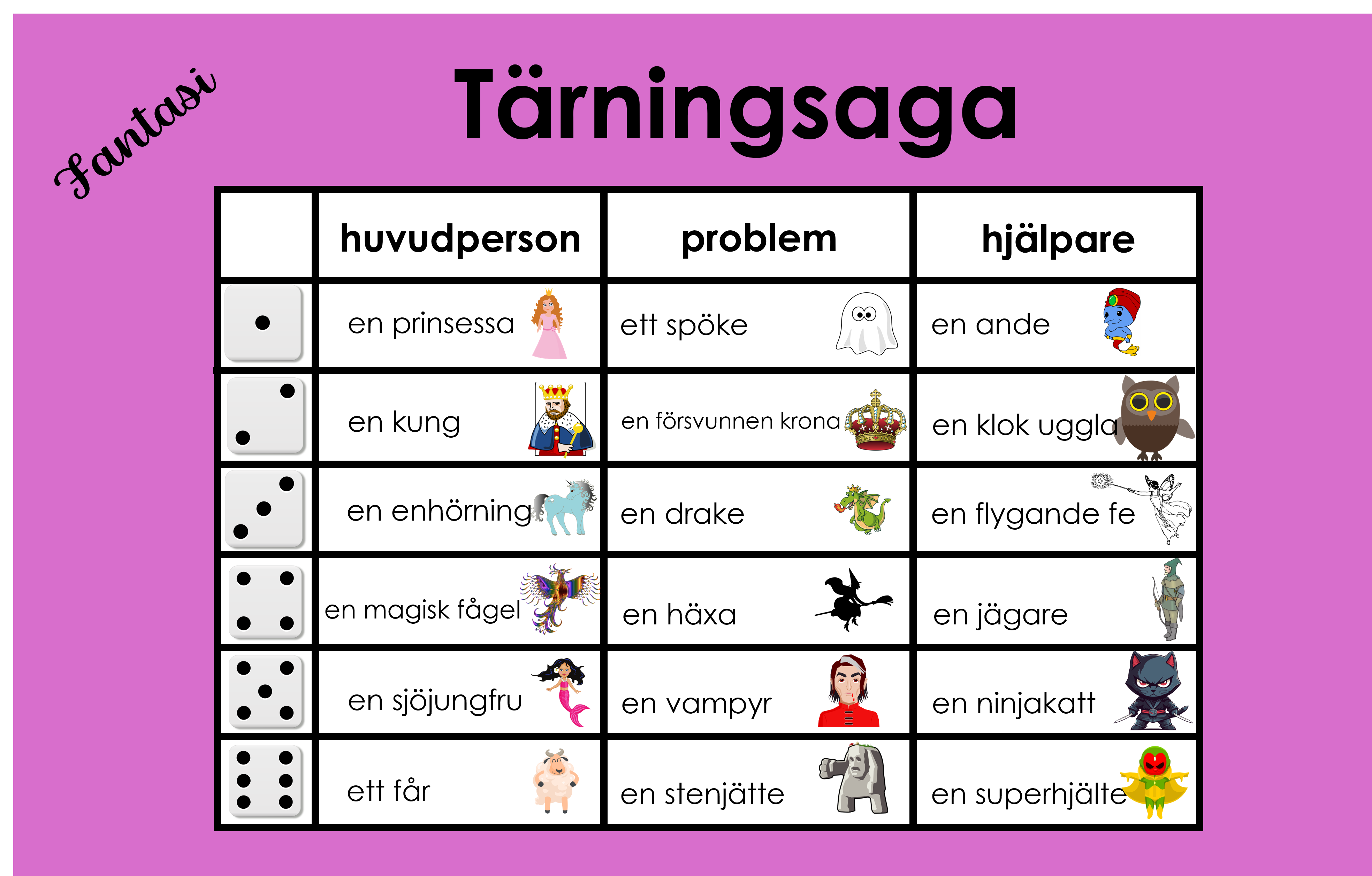 Det är materialet är 5 sidor med tärningssagor. Barnet rullar tärningen och ser vem ska bli huvudpersonen, vem som är problemet och vem som är hjälparen. Barnet kan skriva sagan själv, i par eller i grupp. De stora bilderna kan man använda för helklassen eller så kan barnet själv välja vilka figurer som man ska slå mellan. Detta material är med temat fantasifigurer som troll, häxor, älvor, prinsar och prinsessor.