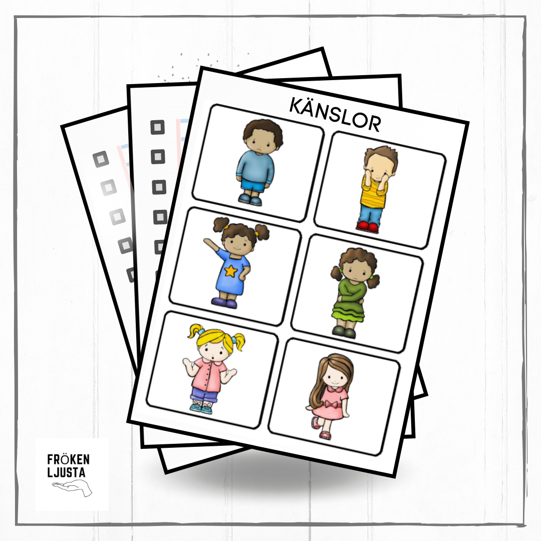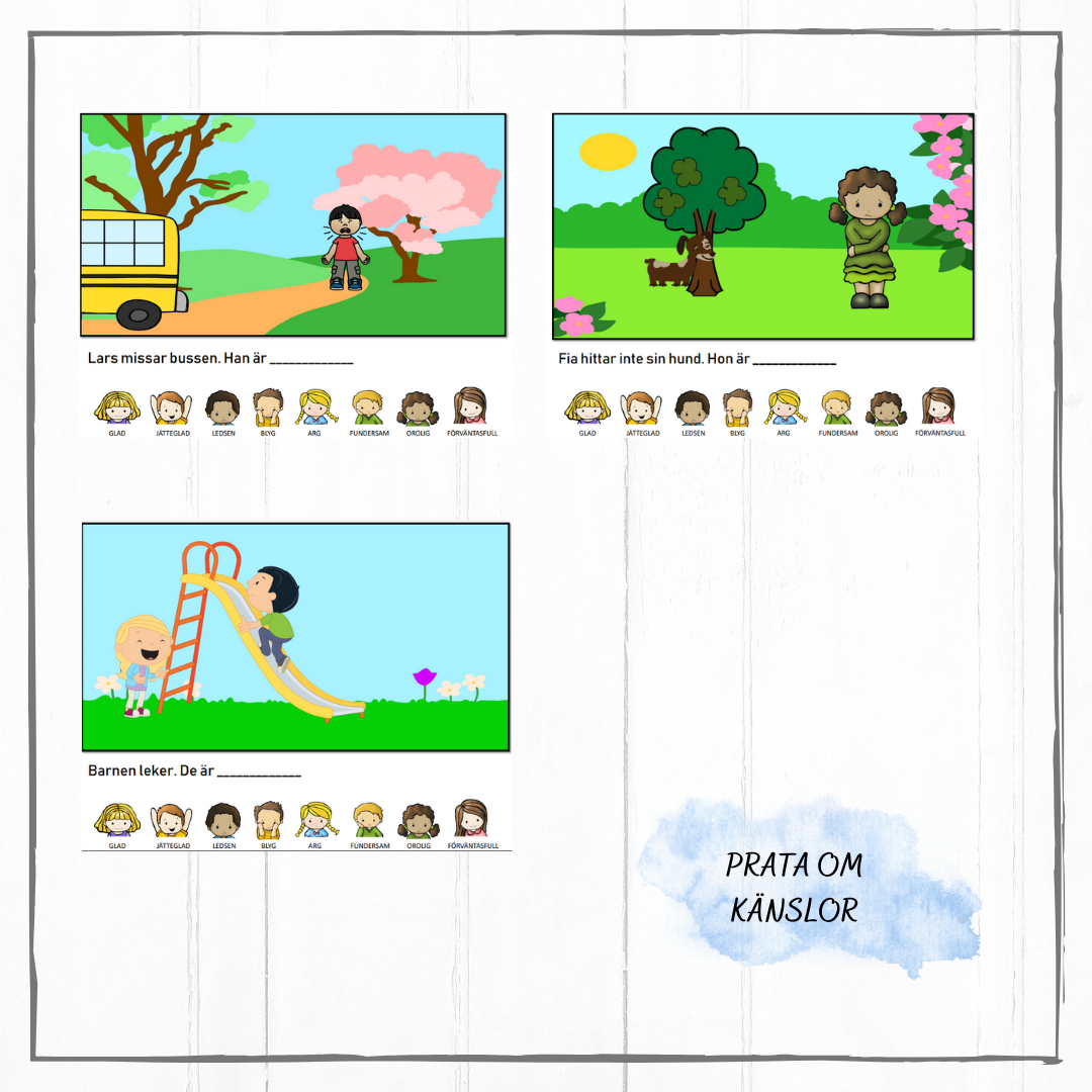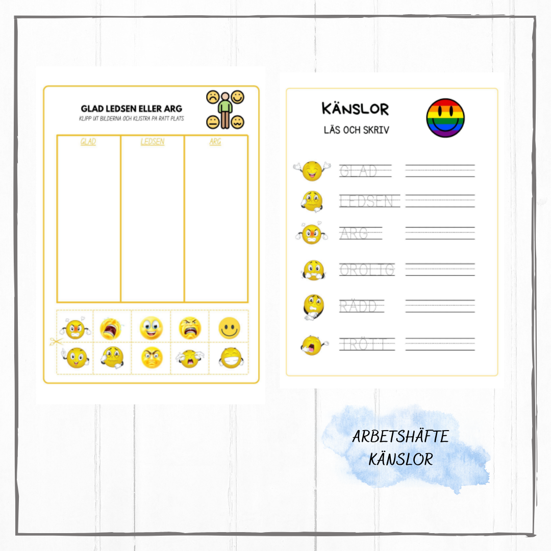 Här finns cirka 70 sidor att arbeta med omkring känslor. Materialet består utav: