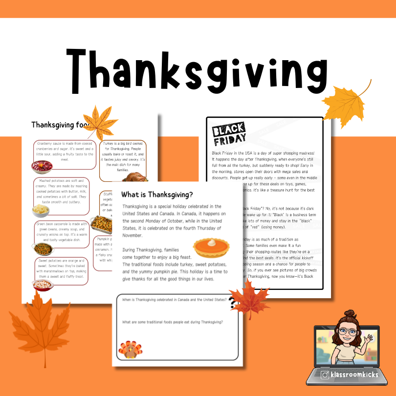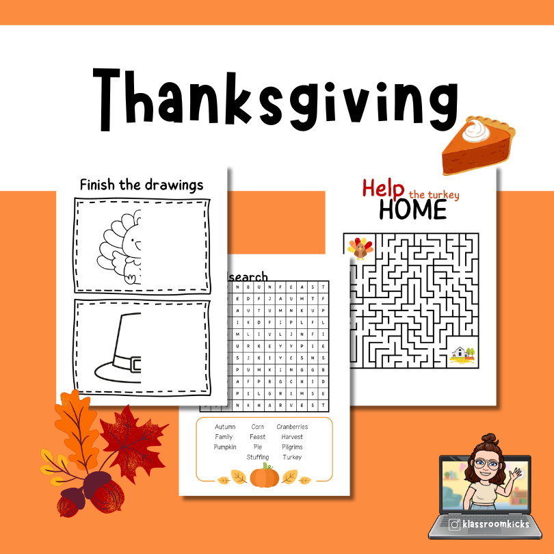 Häfte inför Thanksgiving, innehåller: - Texter med frågor om maten, högtiden och black friday. - Labyrint - Wordsearch + korsord - Målarbild