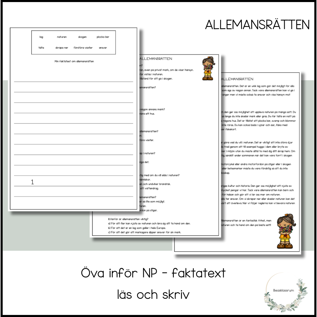 Material för att träna till NP - läs faktatext om allemansrätten och svara på läsförståelsefrågor med svarsalternativ -skriv en egen text med 8 ord.