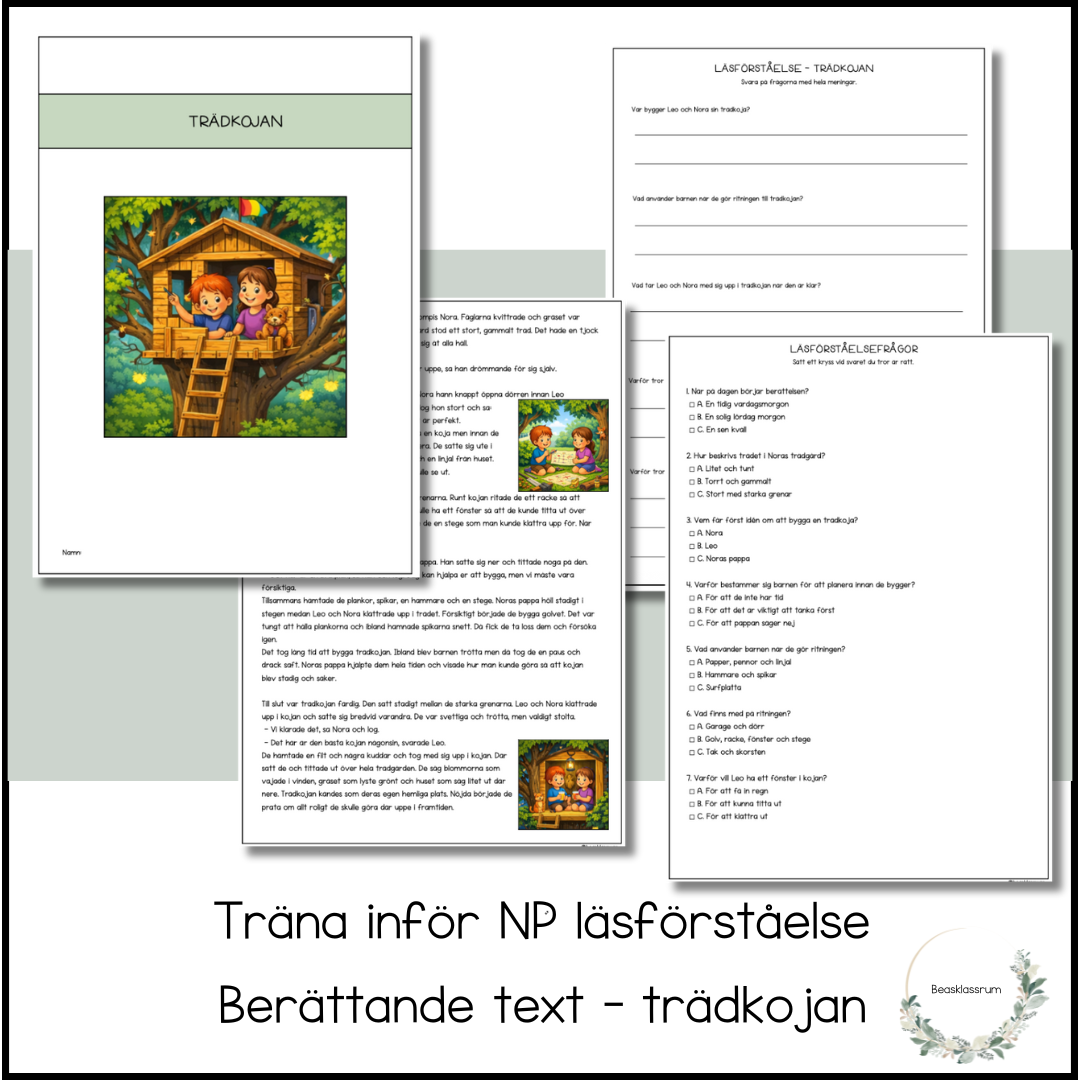 Material för att träna till NP Tema Trädkojan - läs berättande text och svara på läsförståelsefrågor 15 stycken kryssfrågor 5 stycken frågor där eleverna skriver egna svar