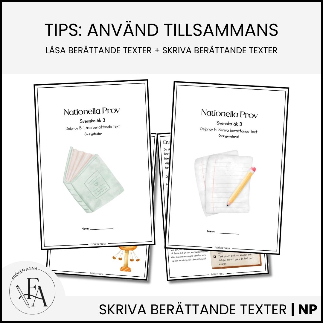 Detta material innehåller övningsuppgifter och strukturerad vägledning som hjälper elever i årskurs 3 att träna på att skriva berättande texter, en del av de nationella proven i svenska. Med engagerande och åldersanpassade teman får eleverna möjlighet att utveckla sin kreativitet, struktur och språkhantering i berättande form.