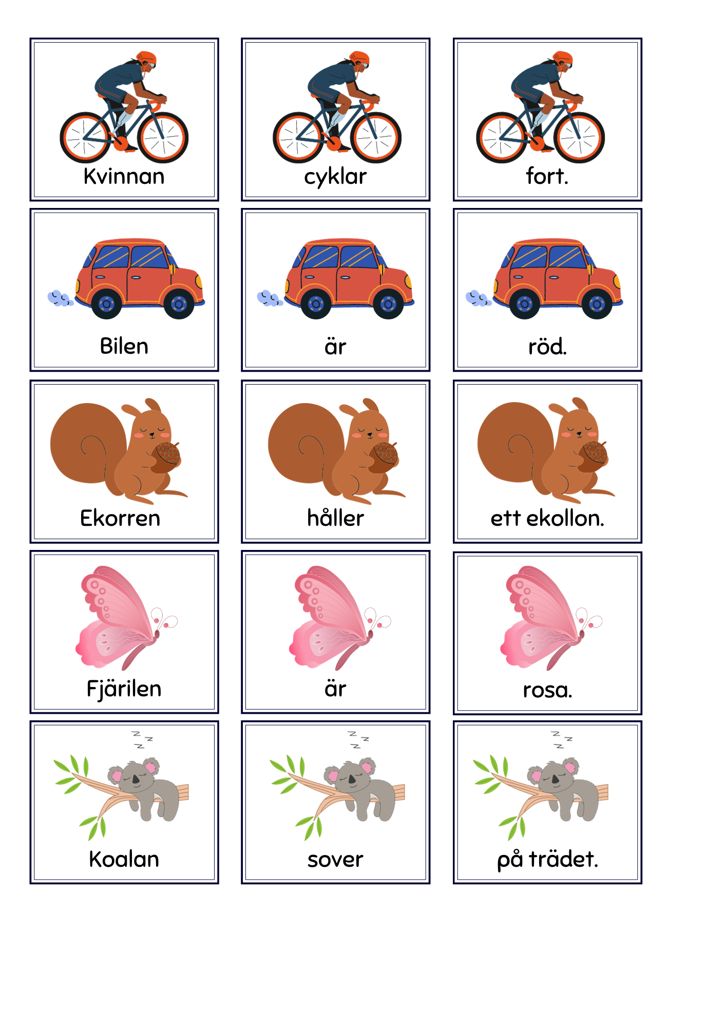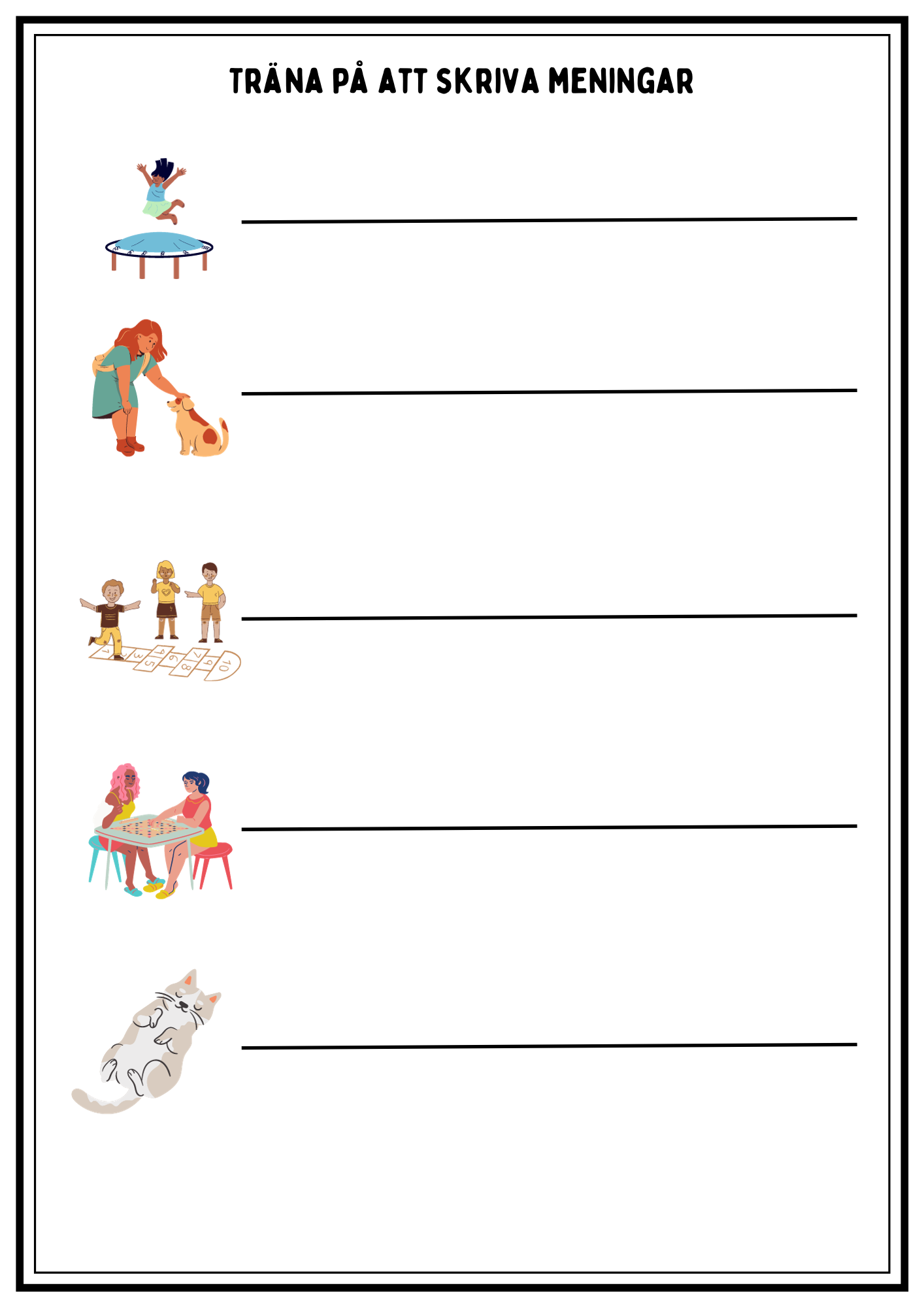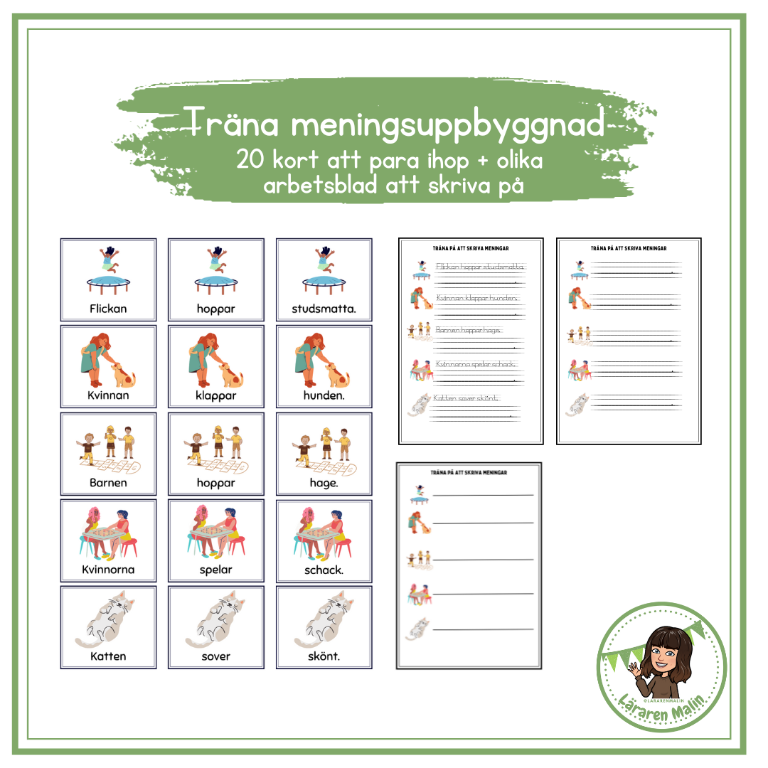 Träna meningsuppbyggnad. Detta material innehåller 20 *3 olika bilder att klippa och laminera och där eleverna ska sätta de i rätt ordning så de bildar en korrekt mening. Sen kan man välja att eleverna får skriva av meningen på nån av de 3 olika arbetsbladen som medföljer; ett med skrivhjälp, ett med bara välskrivningsrader samt en med enkla rader till bilden.