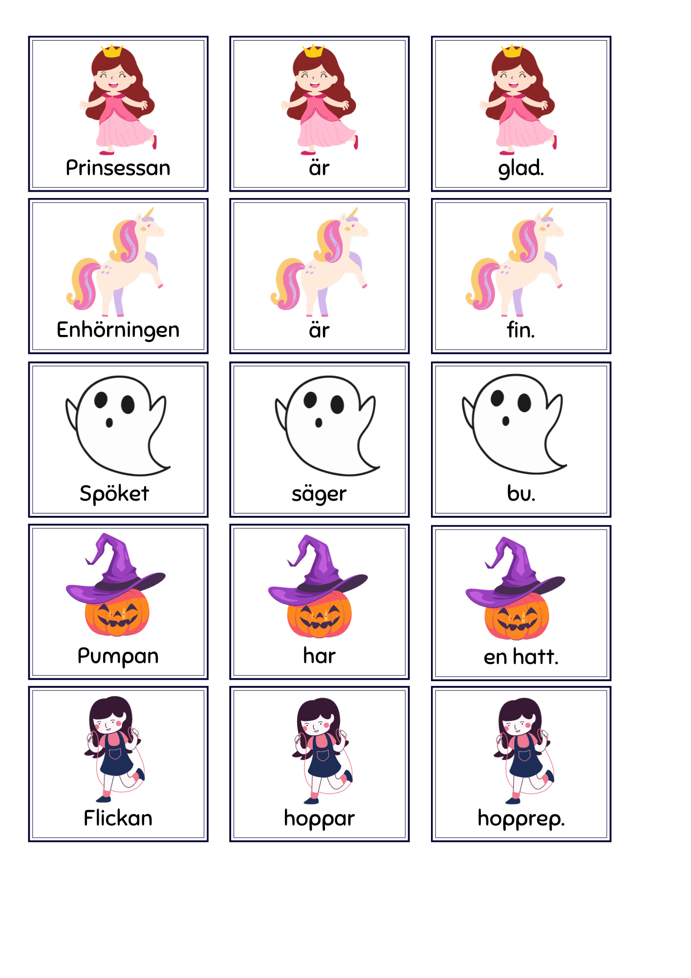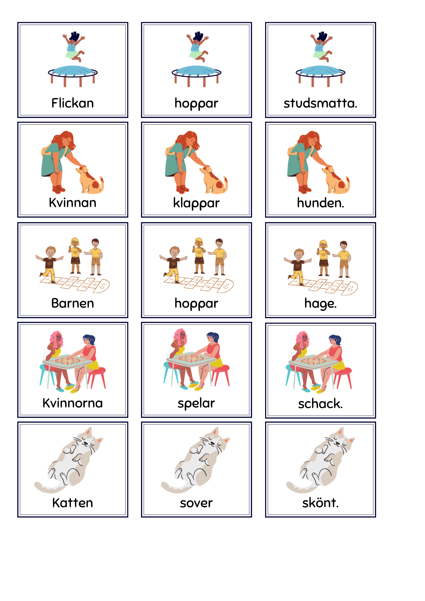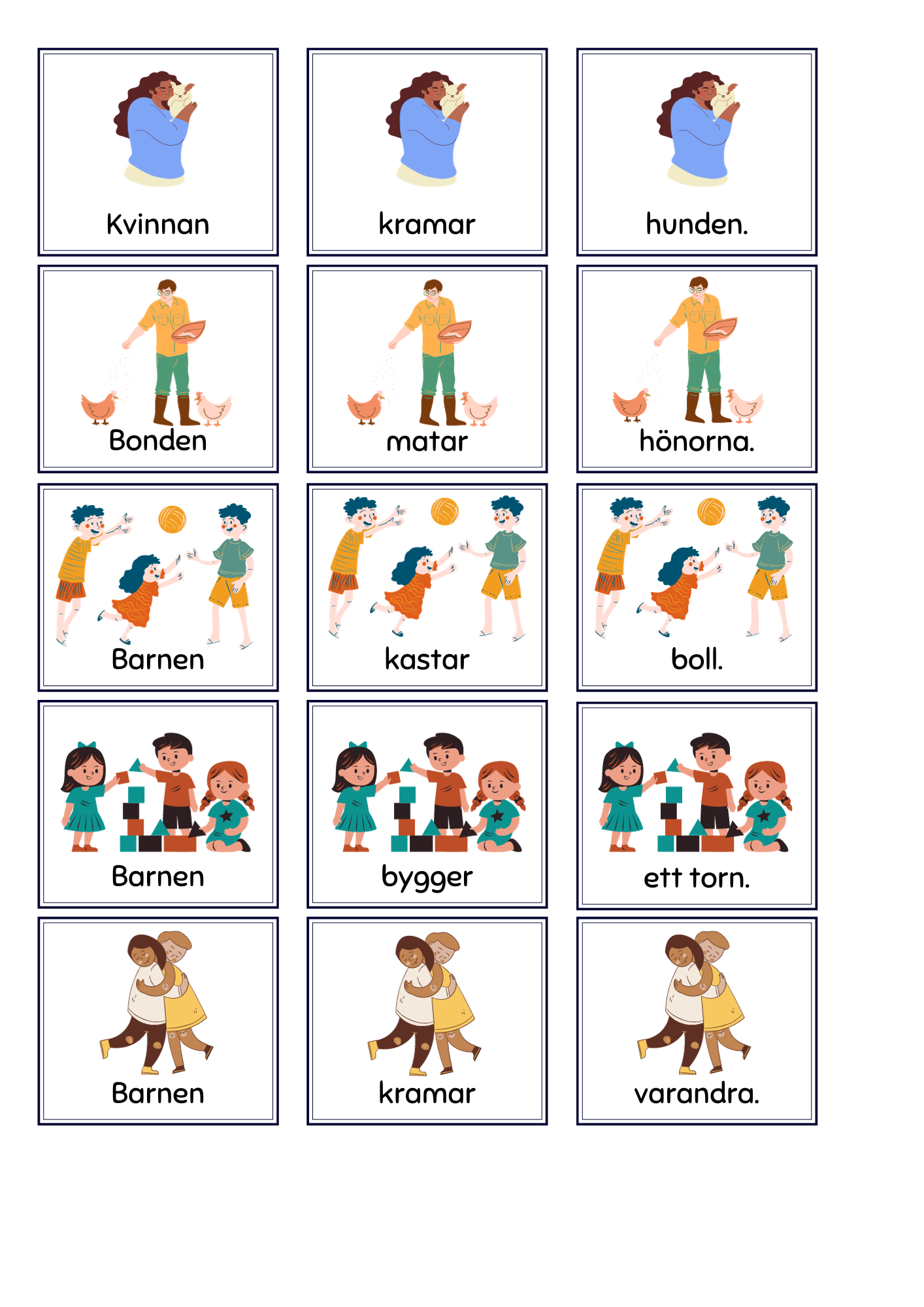 Träna meningsuppbyggnad. Detta material innehåller 20 *3 olika bilder att klippa och laminera och där eleverna ska sätta de i rätt ordning så de bildar en korrekt mening. Sen kan man välja att eleverna får skriva av meningen på nån av de 3 olika arbetsbladen som medföljer; ett med skrivhjälp, ett med bara välskrivningsrader samt en med enkla rader till bilden.