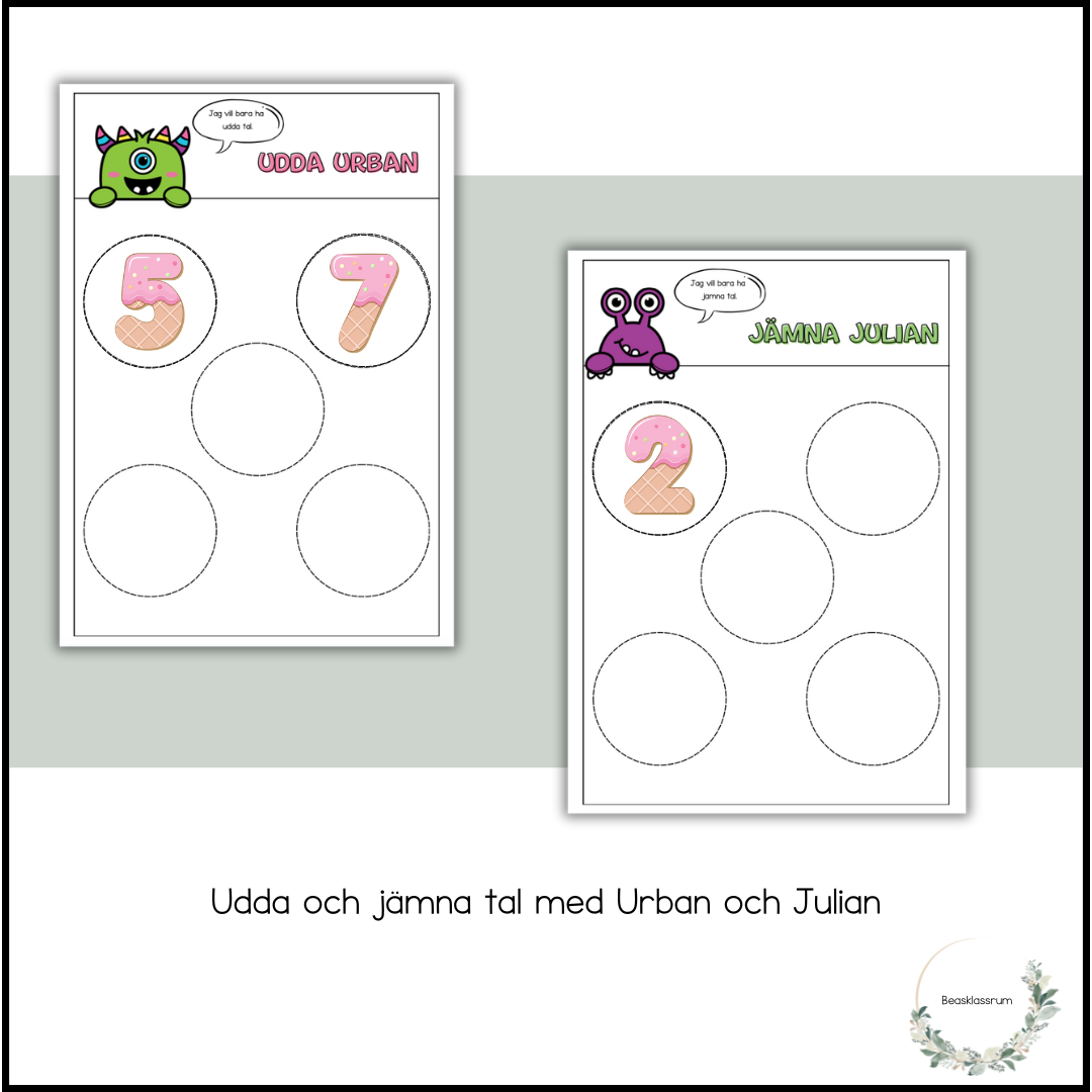 Urban och Julian älskar glass men Urban vill bara äta udda tal och Julian vill bara äta jämna tal. Låt eleverna träna förmågan att klippa när de klipper ut cirklar med tal samtidigt som de tränar på begreppet udda/jämna tal. Material finns med och utan färg på monstren.