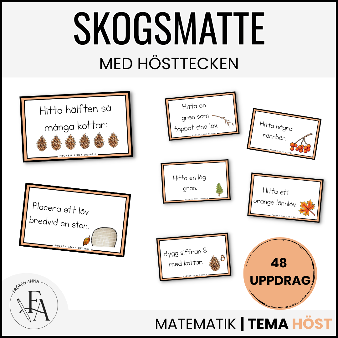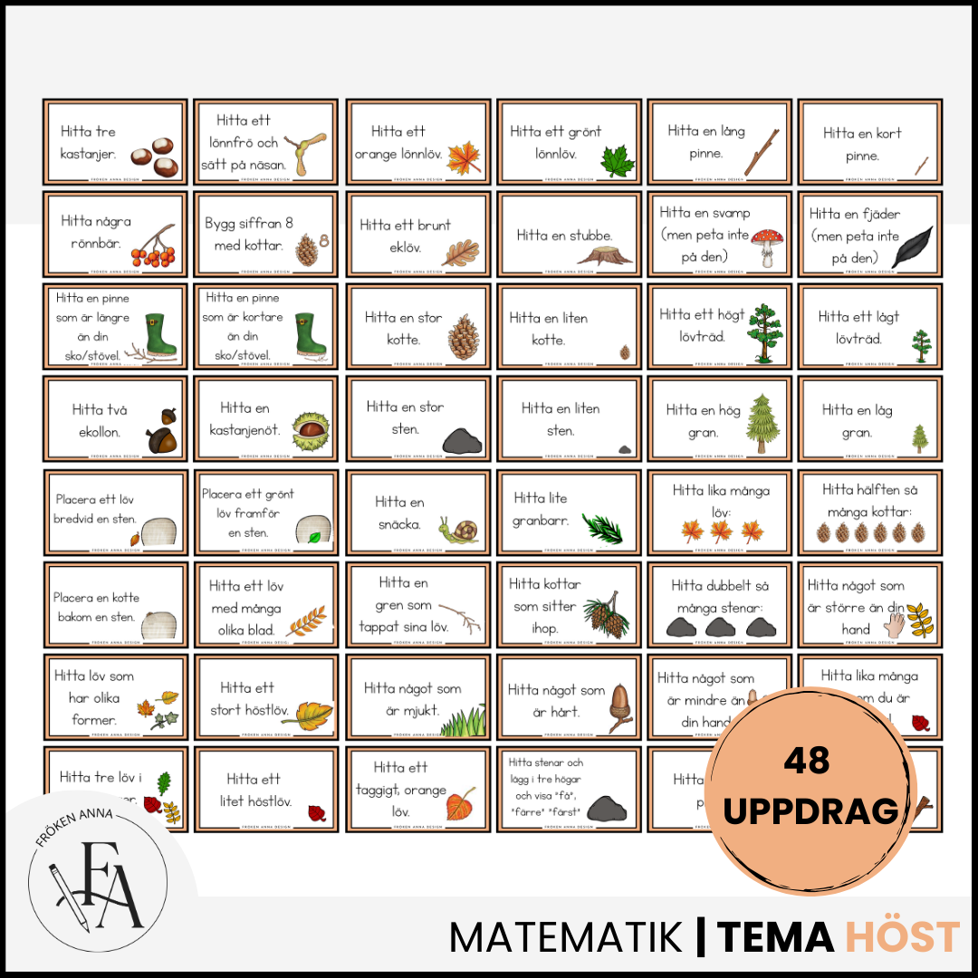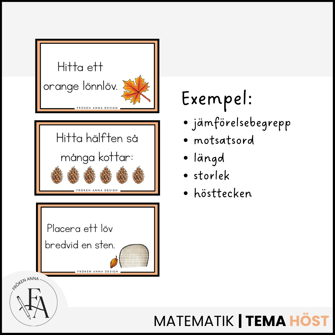 Skogsmatte med hösttecken – 48 uppdrag att utföra i den vackra höstnaturen: Exempel på innehåll: Jämförelsebegrepp Motsatsord Längd Storlek Hösttecken