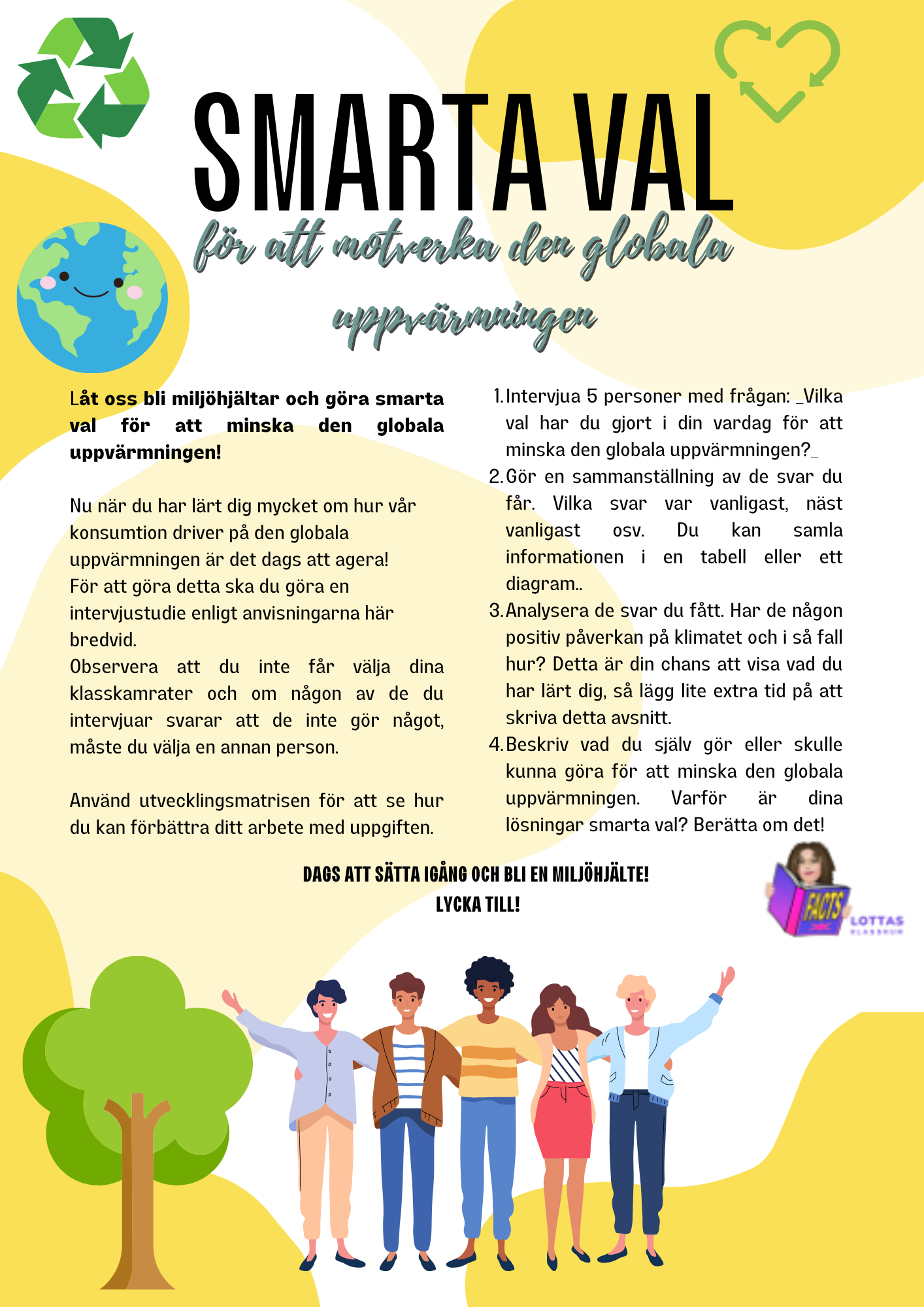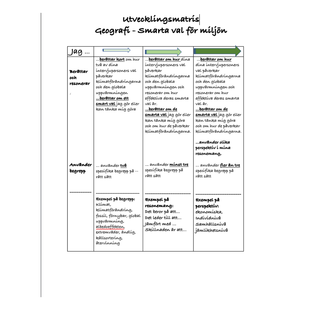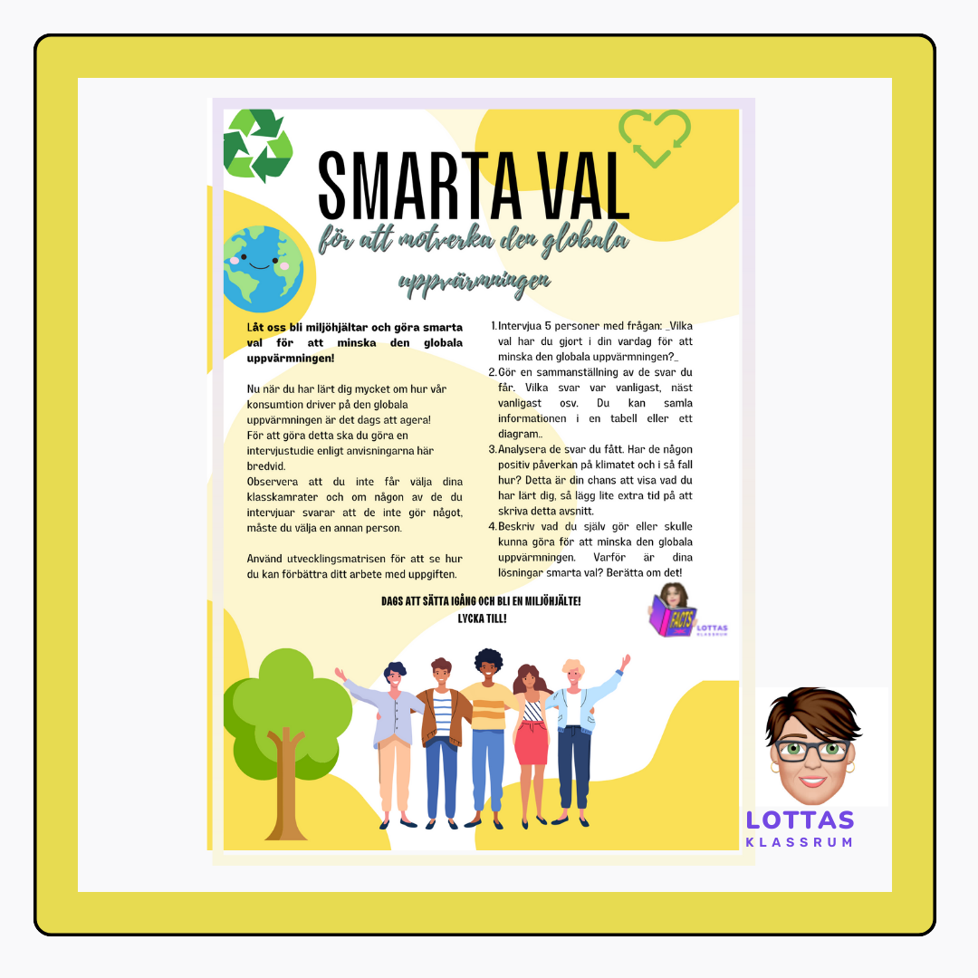 Låt eleverna bli miljöhjältar genom denna uppgift inom arbetsområdet Hållbar utveckling. Uppgiften är en intervjustudie och bifogat finns även en utvecklingsmatris för elever att använda som hjälp för hur de kan förbättra sitt resonemang. Matrisen är även till hjälp till dig som lärare vid din bedömning.