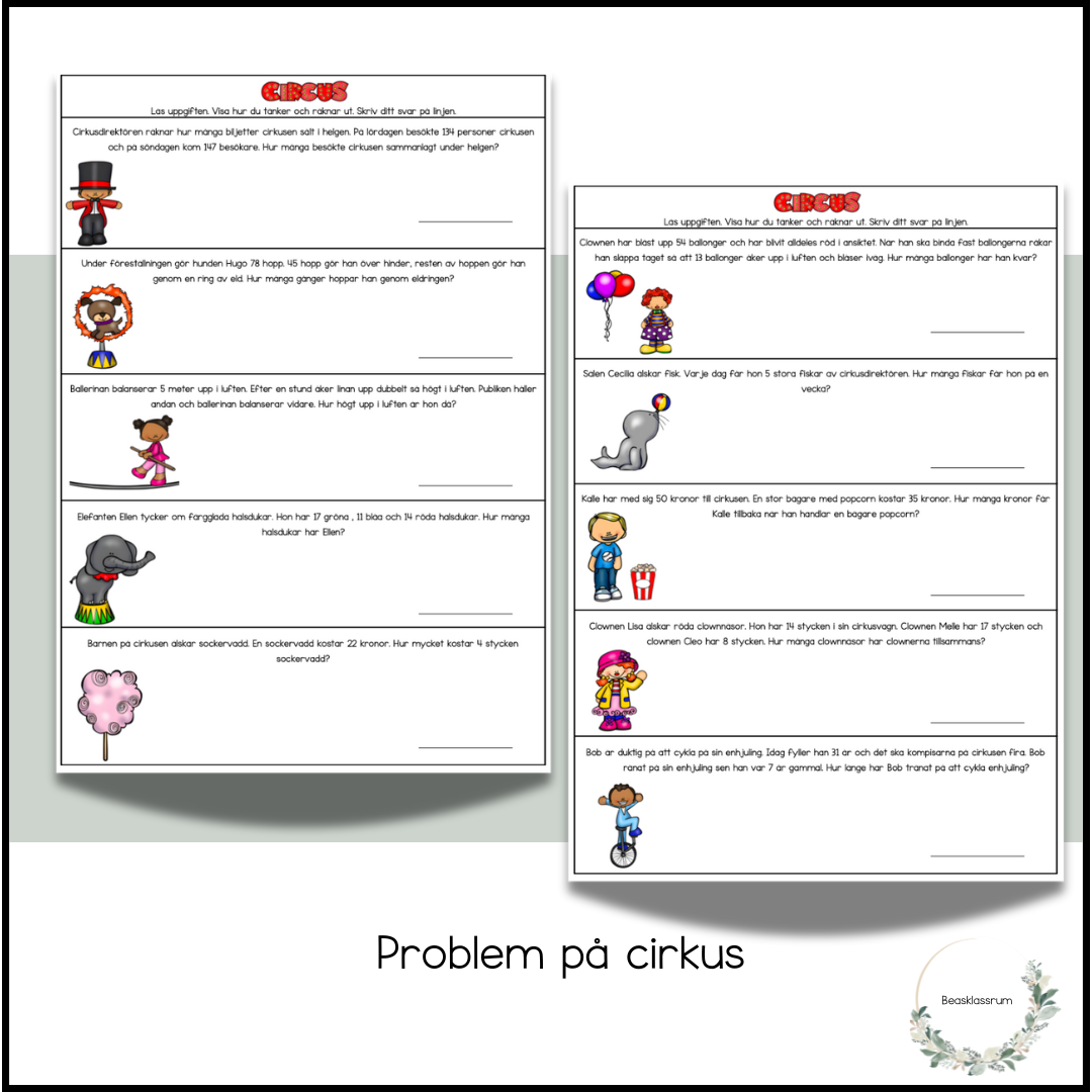2 arbetsblad där eleverna får hjälpa cirkuspersonalen med problemlösningsuppgifter.