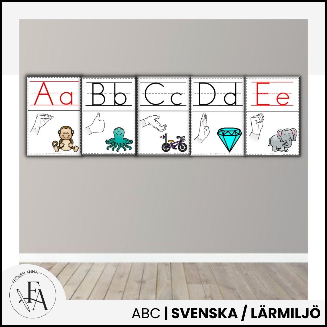 Väggalfabet med tecken som stöd. A4 och mindre småkort ingår