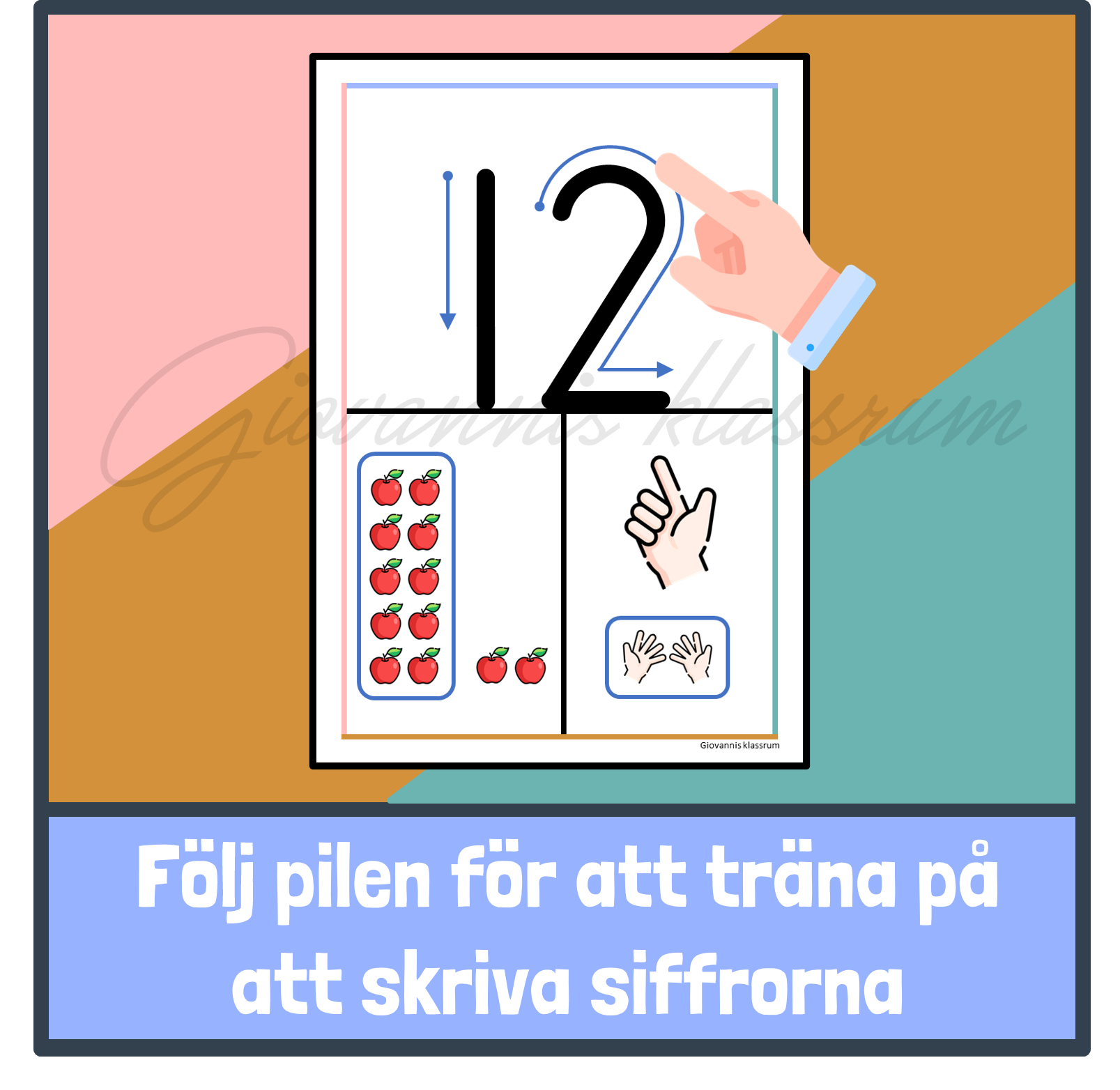 I varje klassrum finns det ett alfabet, men samma sak är inte lika självklar när det kommer till siffror och tal. Dessa sidor kan sättas upp i klassen varje gång ett nytt tal introduceras för att hjälpa eleverna med skrivriktningen och hur talet skrivs på ett korrekt sätt. Ett tips är att använda dessa som en exit ticket genom att sätta upp dem bredvid dörren och låta eleverna följa talet med fingret på vägen ut från klassrummet.