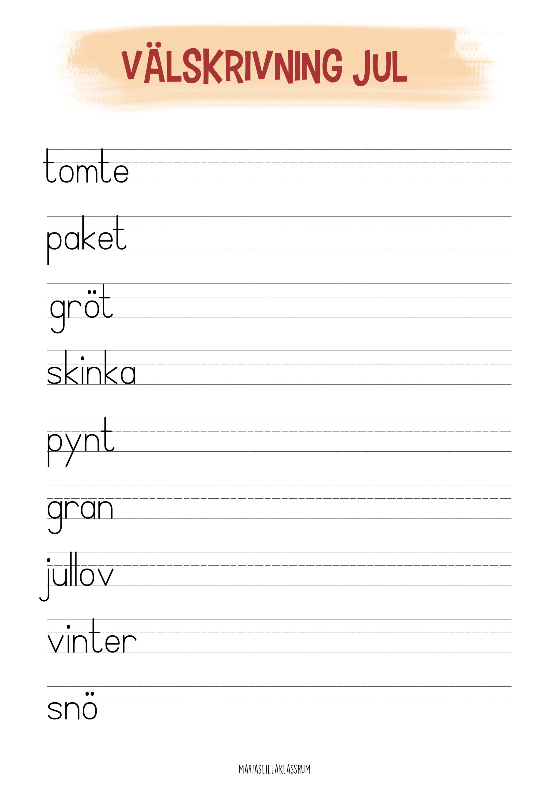 Väskrivning tema jul. Stencil 1 – skriv orden Stencil 2 – skriv meningar med orden.