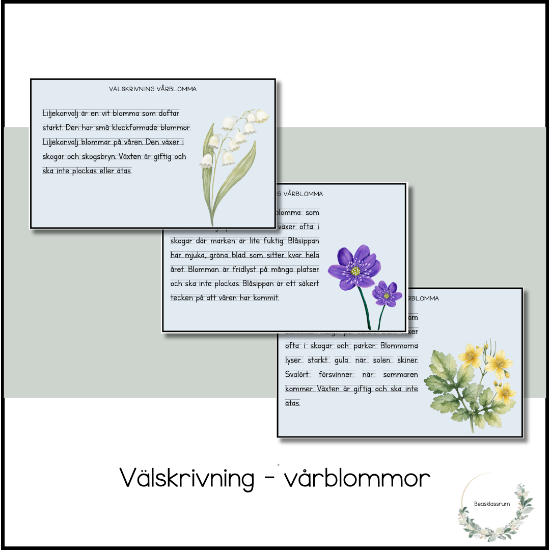 Träna välskrivning och låt eleverna samtidigt lära sig mer om vårblommor. 16 kort.