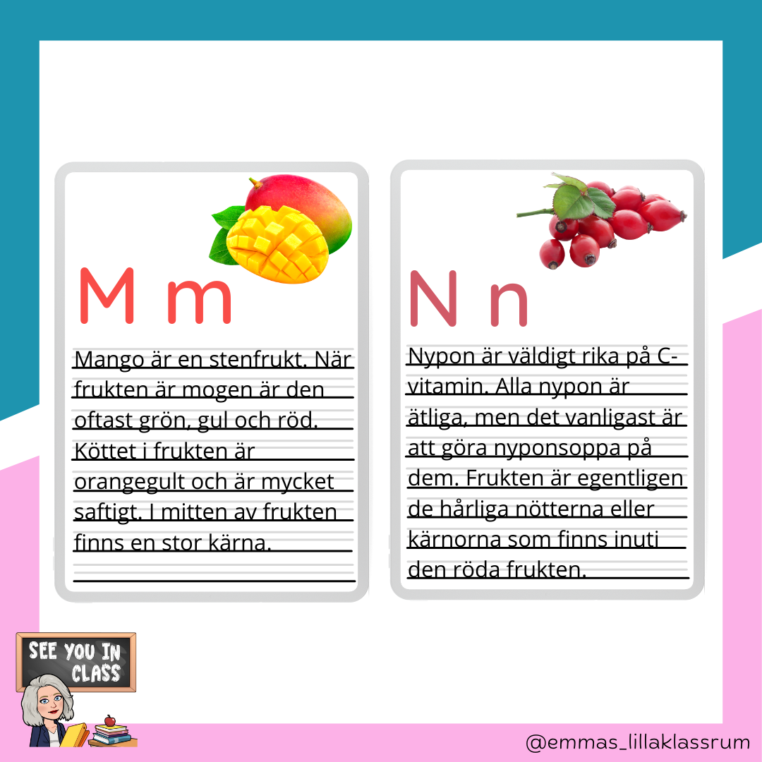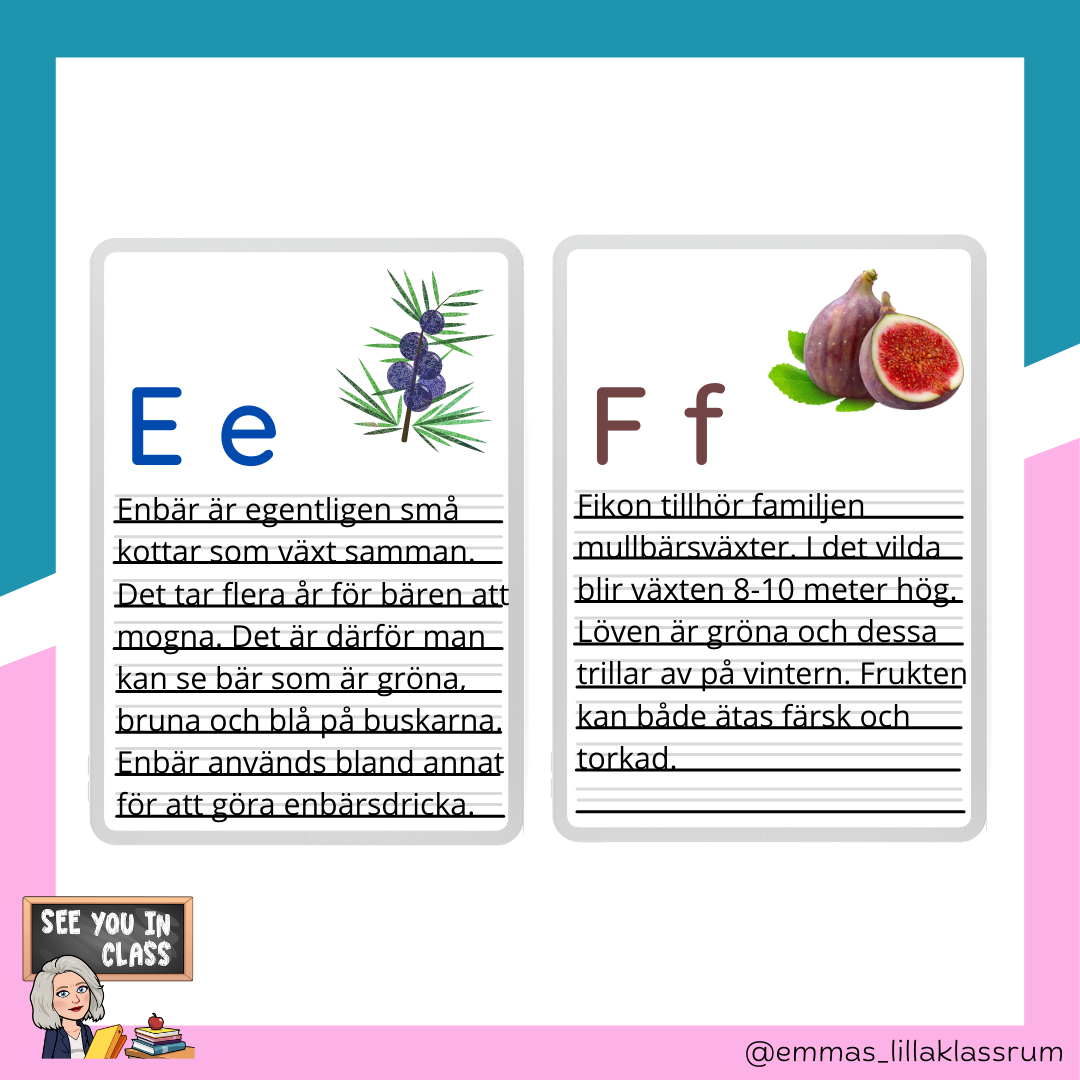 Materialet innehåller ett välskrivningskort till varje bokstav i alfabetet, med fokus på frukt, bär och grönsaker. Några bokstäver har fått andra ätbara saker, då det inte funnits bär, frukt eller grönsaker på bokstaven. Q har blivit quinoa, X har blivit xylitol och Y har blivit yoghurt. Materialet kan användas som faktakort när man pratar om alfabetet eller så kan de användas som välskrivningskort. En annan tanke är att när man går igenom alfabetet kan eleverna få smaka på sakerna som är på korten. Då blir det som ett "smakalfabet". Titta gärna på mitt andra material. Mycket nöje!