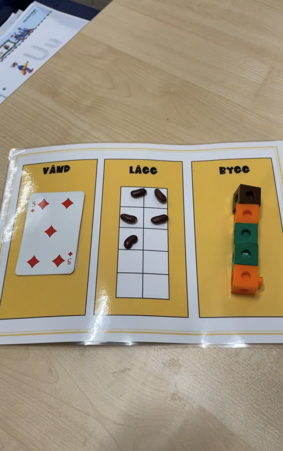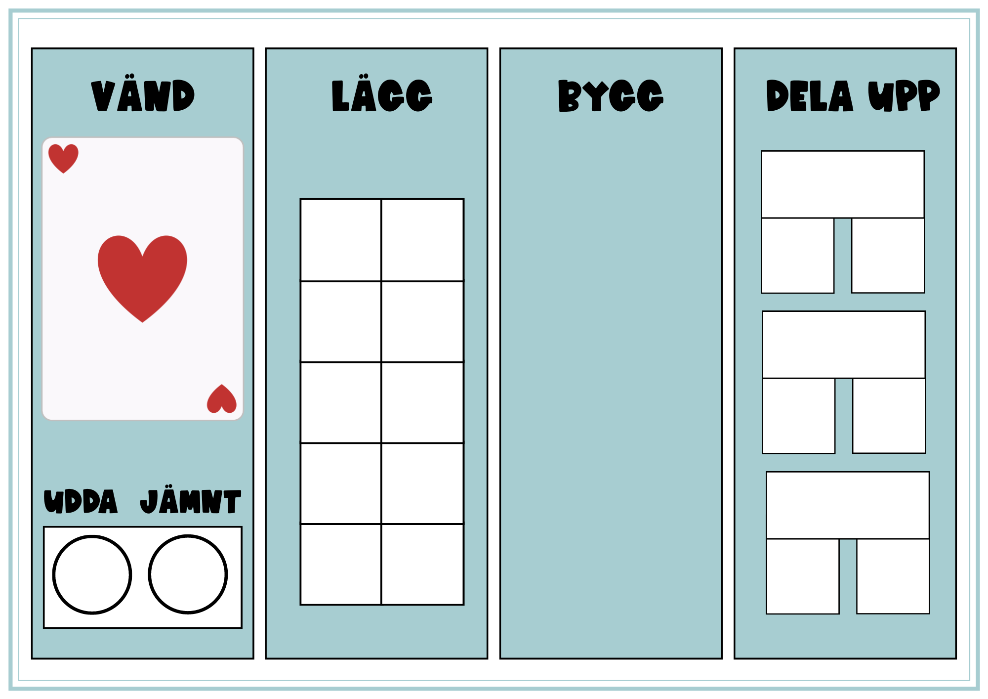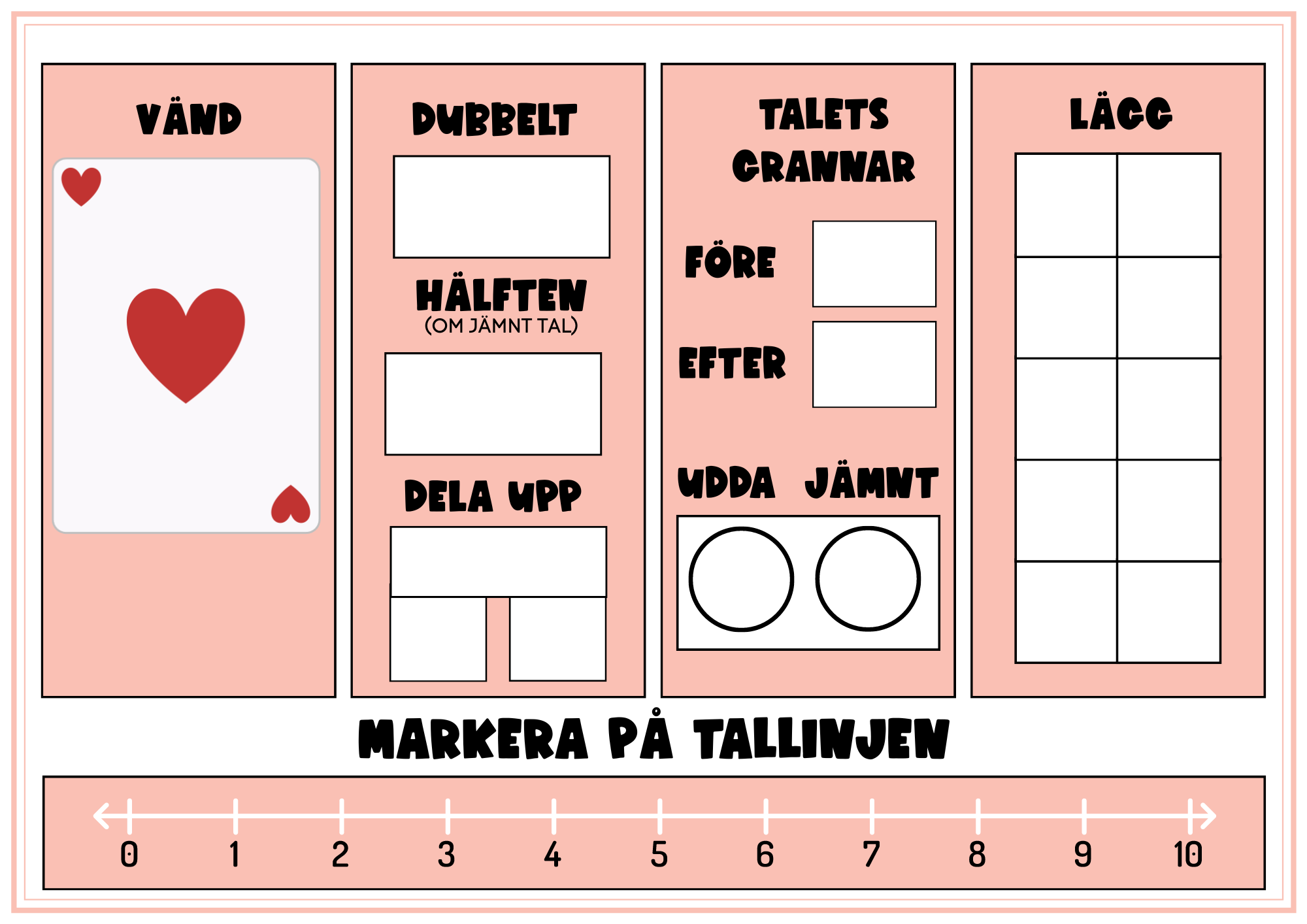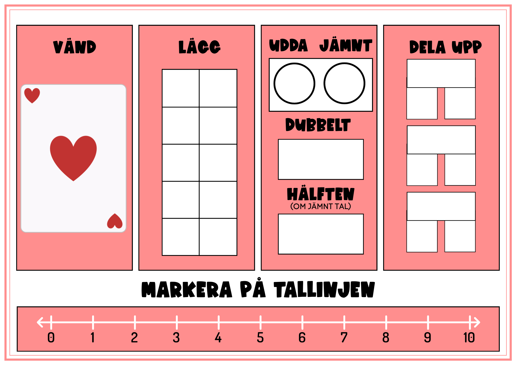 Vänd, lägg, bygg och skriv är 5 olika matte-tavlor. Eleven vänder upp ett kort från exempelvis en kortlek och ska sen lösa uppgifterna på tavlan. Laminera och lägg förslagsvis under en clearboard så kan eleverna använda en whiteboard-penna och markera talet på tallinjen till exempel. Använd byggklossar/bönor till läggmaterial.