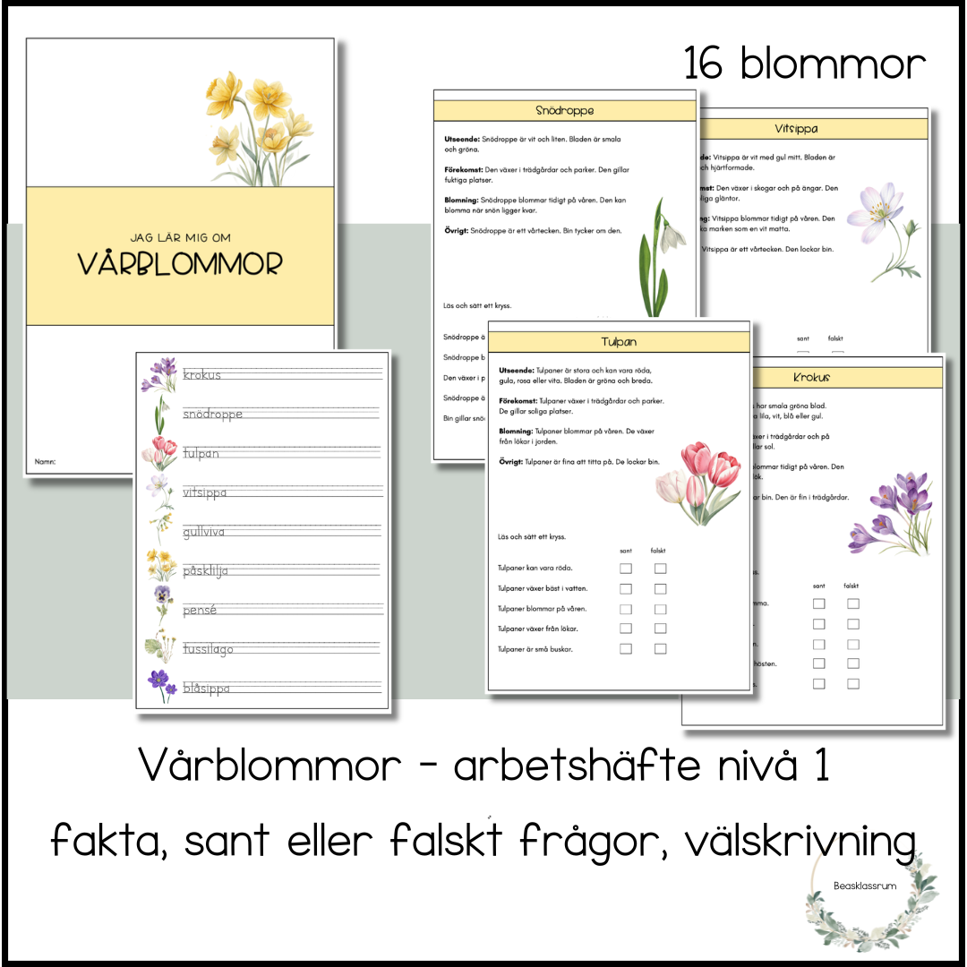 Vårblommor - arbetshäfte nivå 1 18 sidor 1 sida träna välskrivning Faktatext med sant eller falskt frågor till: svalört, krokus, snödroppe, maskros, julros,pärlhyacint, tulpan, vitsippa, gullviva, påsklilja, pensé, tussilago, tusensköna, liljekonvalj, blåsippa, blå akeja