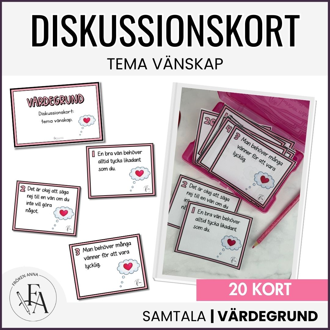 Gör värdegrundsarbetet konkret och engagerande med dessa värdegrundskort! Korten passar utmärkt som både diskussions- eller skrivkort för att reflektera om vänskap, empati och sociala relationer.