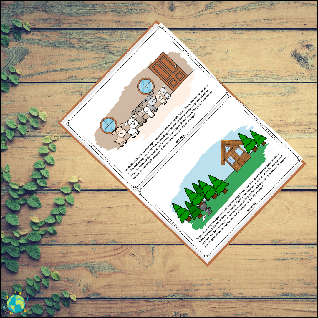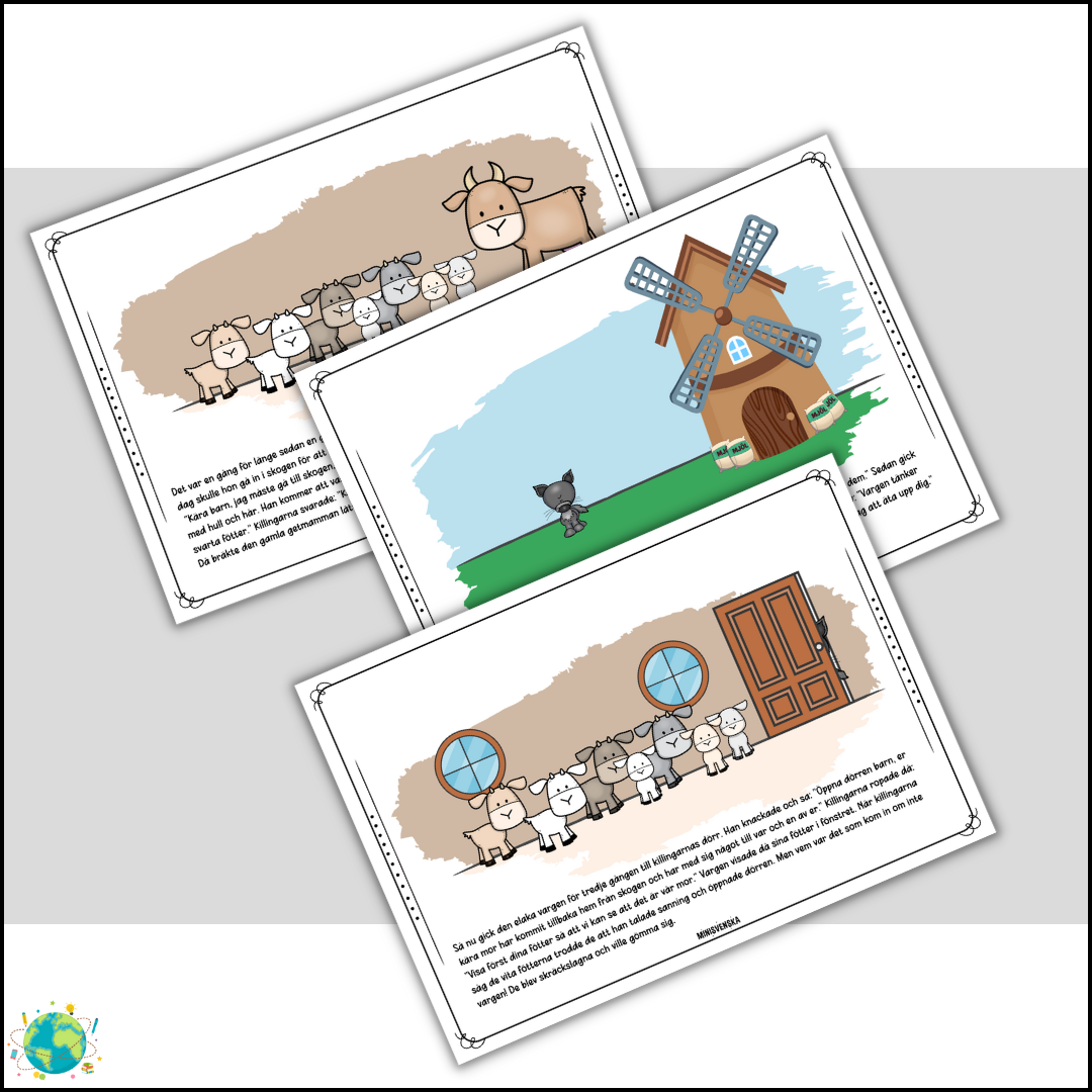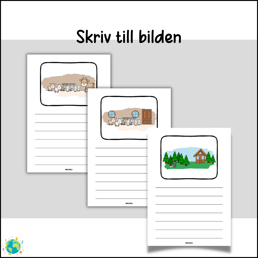 En spännande berättelse om en getmamma som skulle gå och hämta mat i skogen och hon lämnade sina barn hemma. Getmamman sa till sina barn att de absolut inte fick släppa in vargen som lurade i skogen. Berättelsen är 12 sidor med bilder. Till berättelsen finns arbetsblad där eleverna kan skriva till varje bild. PDF: High quality