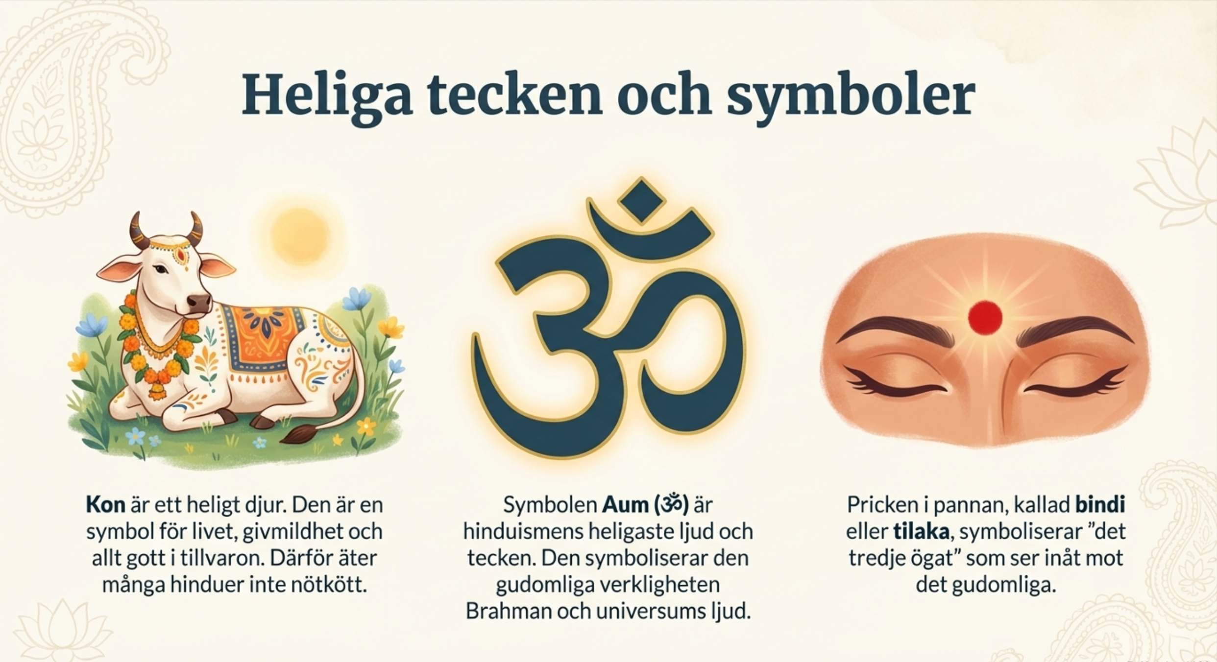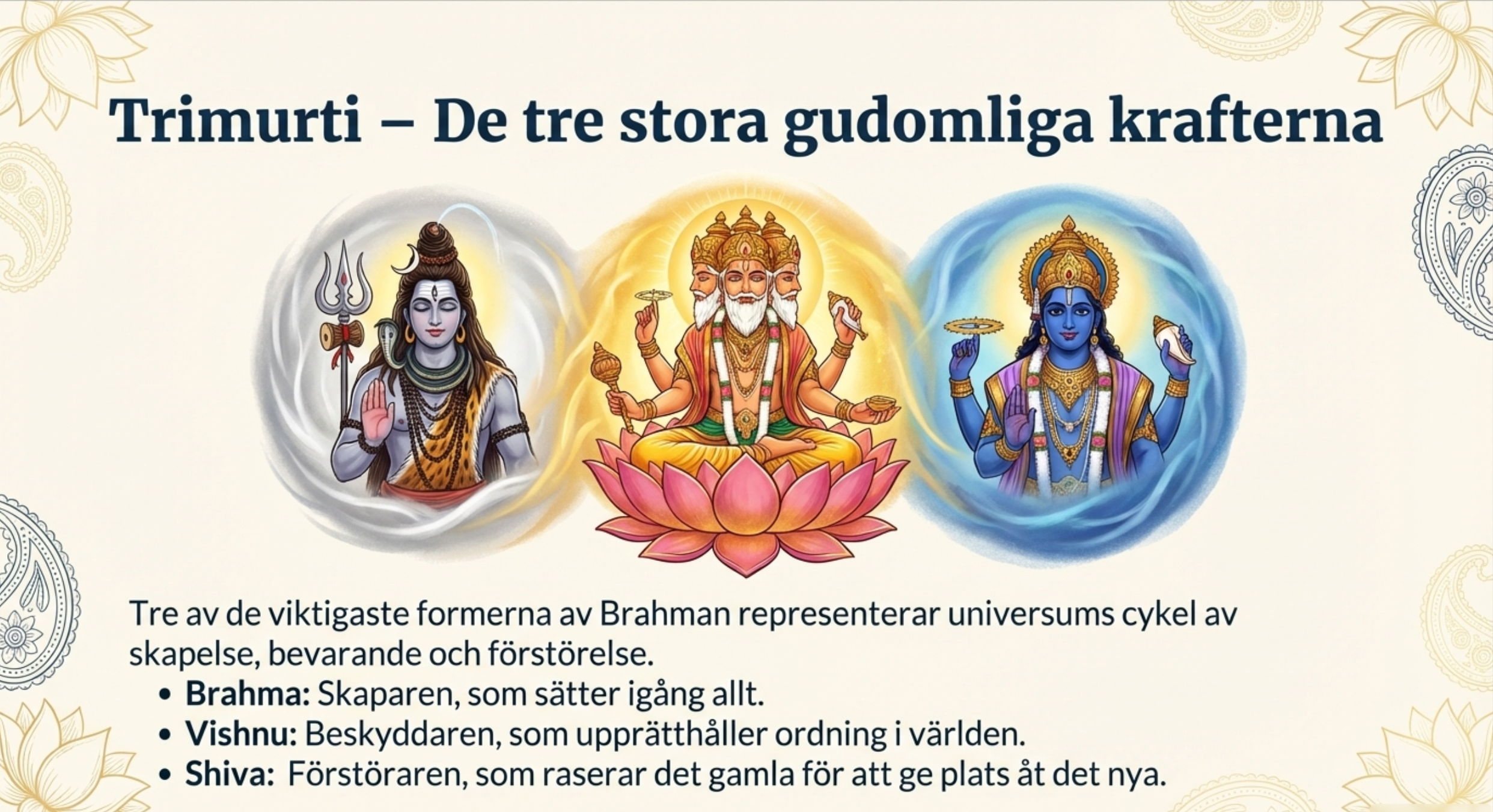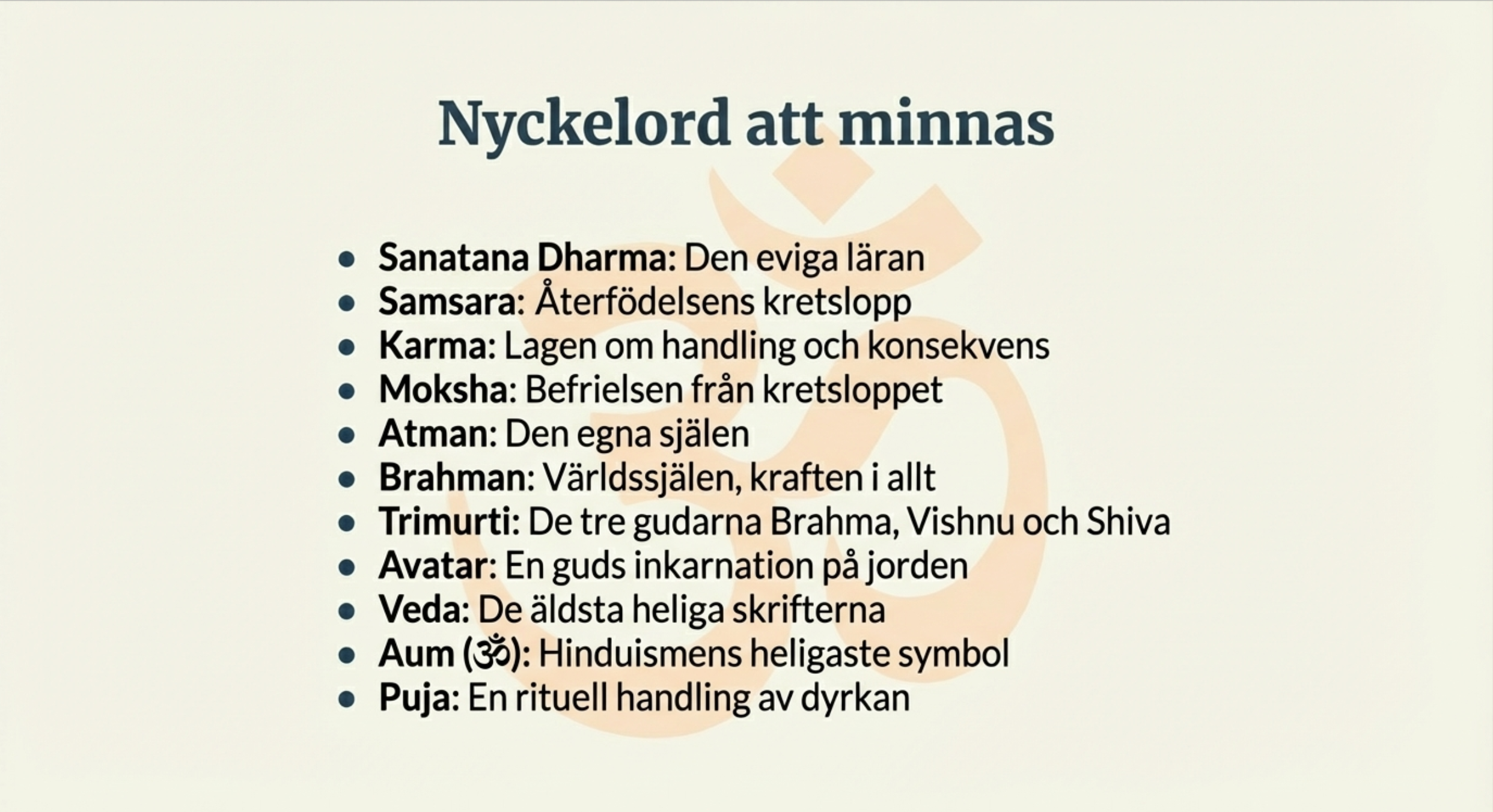Materialet inleds med en översikt av hinduismens bakgrund och ursprung i det forntida Indien. Därefter förklaras centrala begrepp och tankesätt som är avgörande för att förstå religionen, bland annat samsara (själens eviga kretslopp), karma (handlingarnas konsekvenser) och moksha (befrielsen från återfödelsen). Dessa begrepp kopplas till hur de påverkar människors liv, val och mål enligt hinduisk tradition.