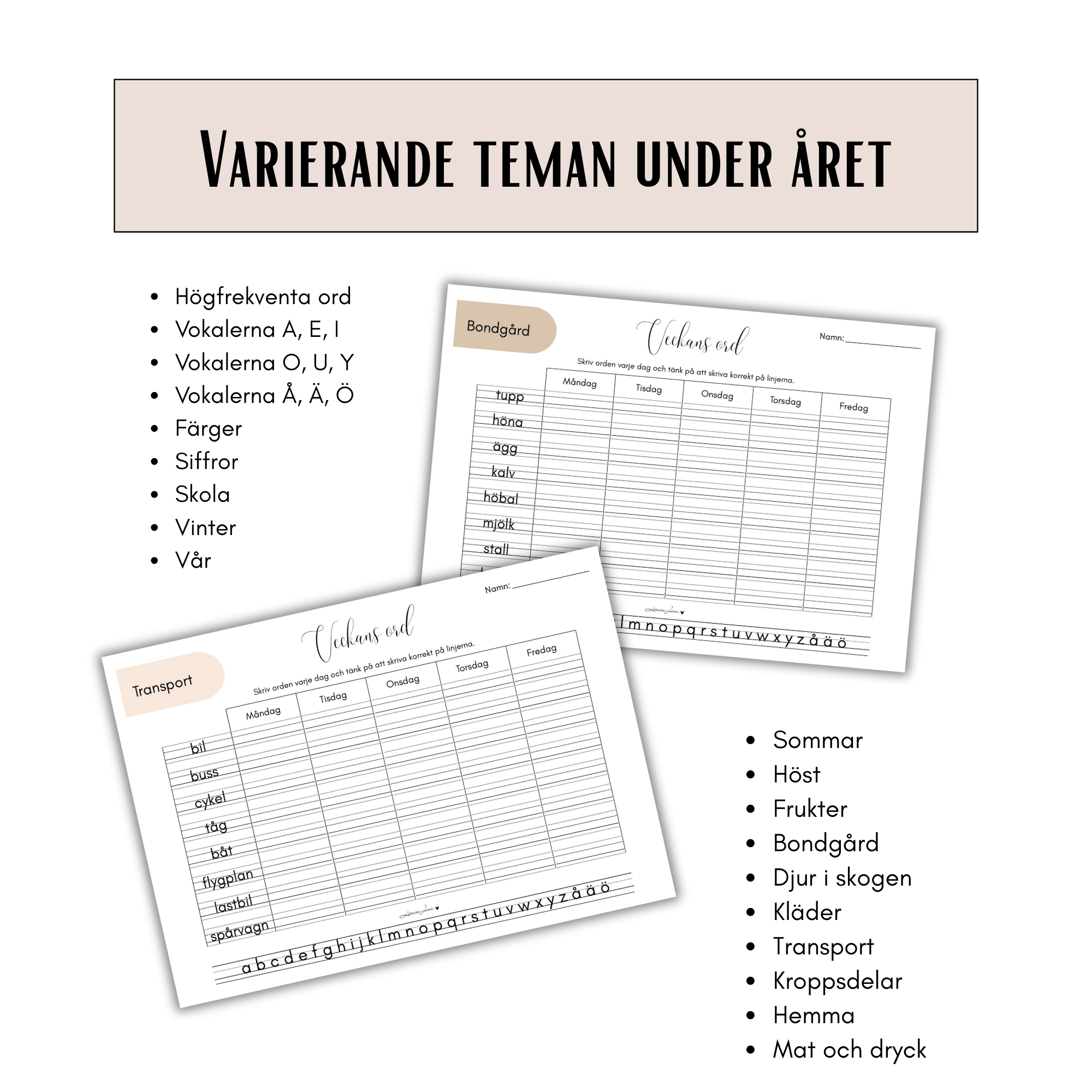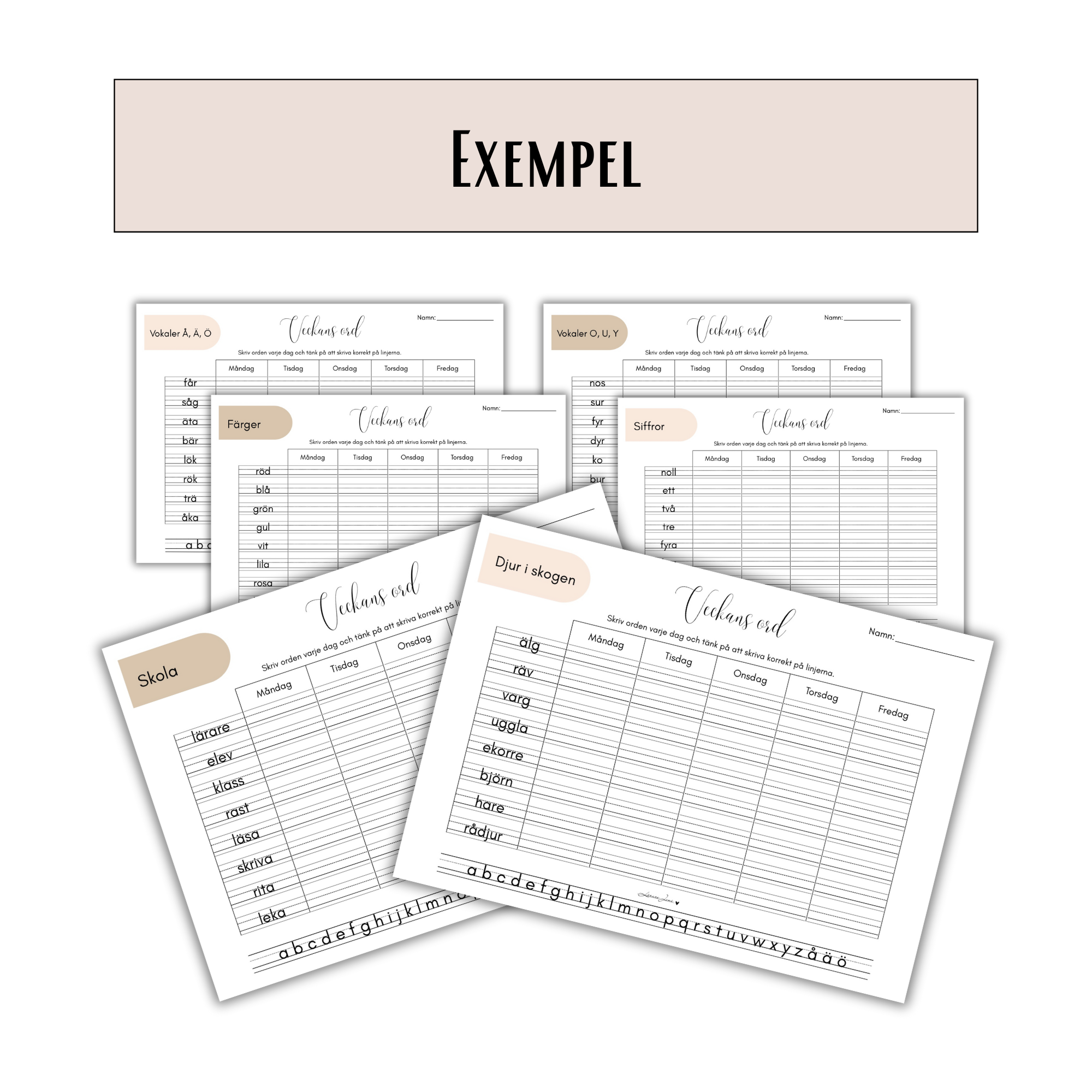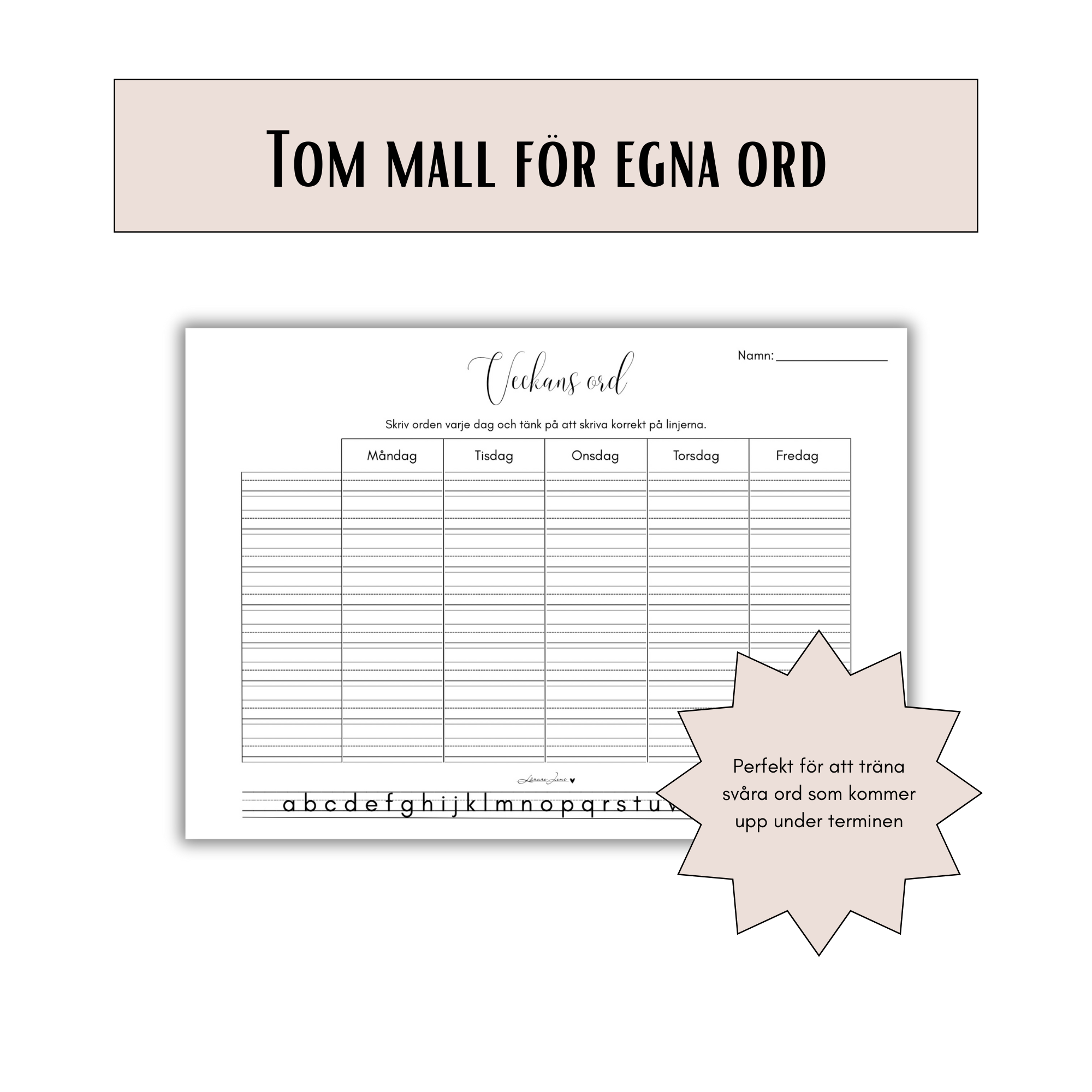 För att ge maximal flexibilitet ingår även en tom mall, där du själv kan skriva in egna veckans ord utifrån klassens/enskilda elevers behov.