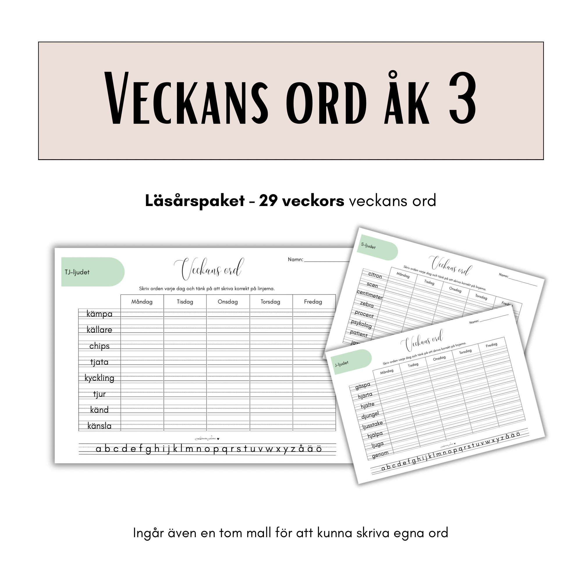 Ett färdigt veckans ord-paket för åk 3. Utformat för att kunna användas under hela läsåret (29 veckor), med utrymme för att pausa veckans ord under ex. Nationella proven.