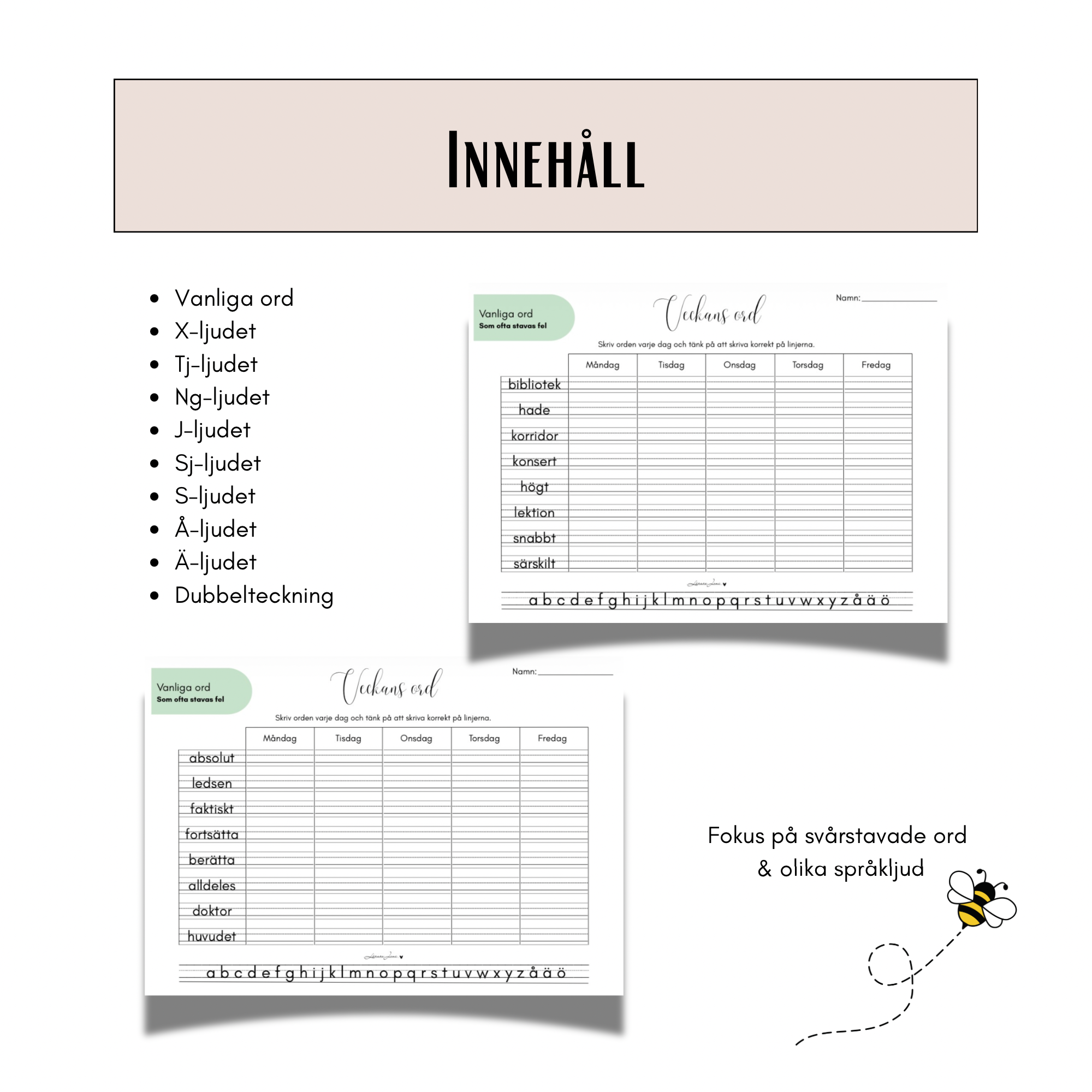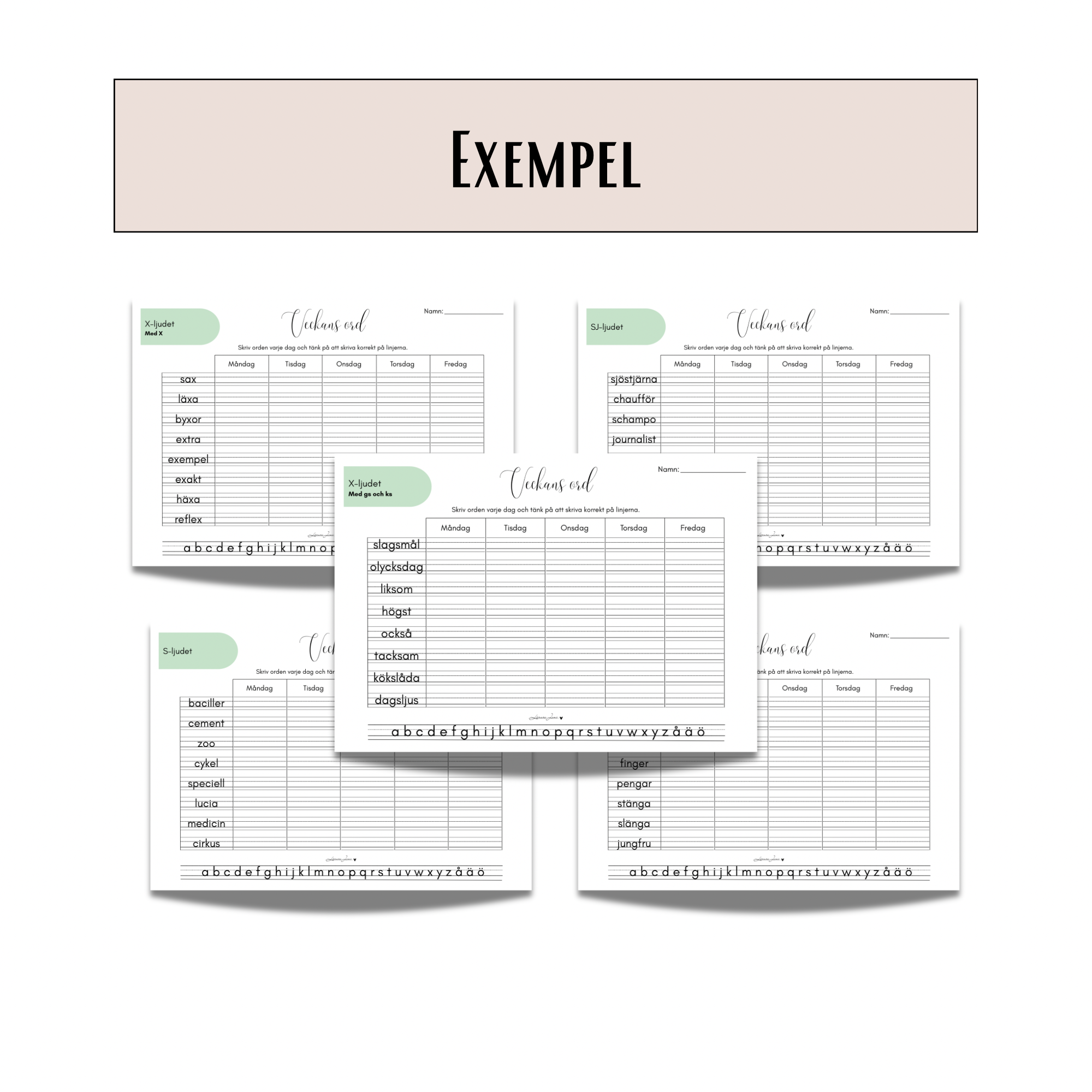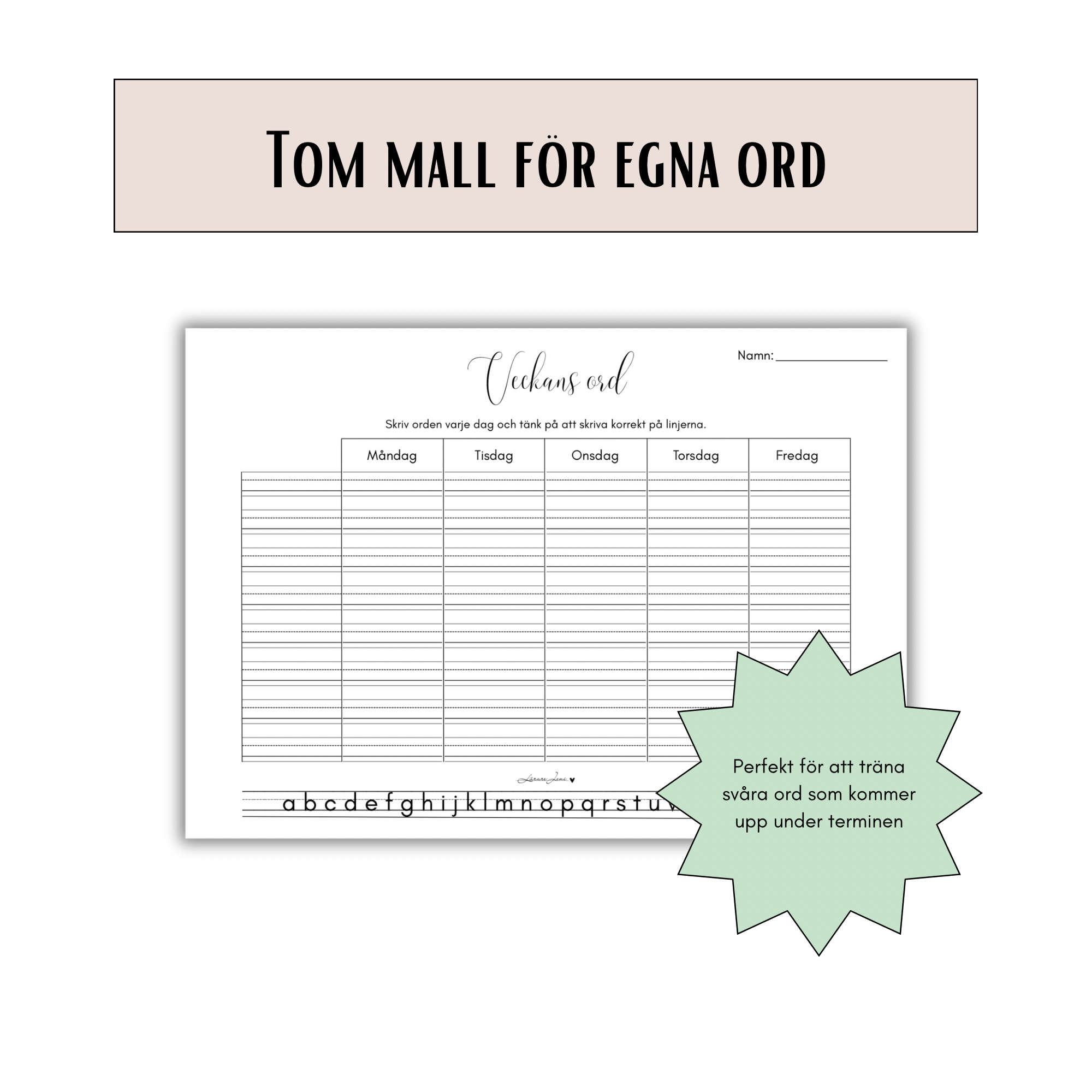 För att ge maximal flexibilitet ingår även en tom mall, där du själv kan skriva in egna veckans ord utifrån klassens/enskilda elevers behov.