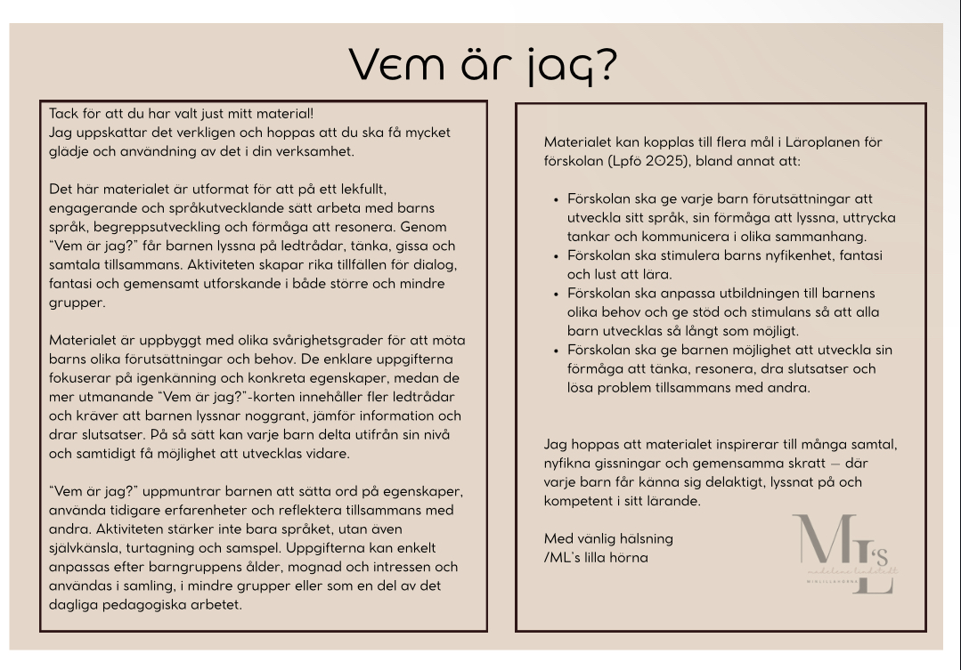 Vem är jag? – lekfull språkutveckling i förskolan “Vem är jag?” är ett pedagogiskt material som på ett lekfullt och engagerande sätt stärker barns språk, begreppsutveckling och förmåga att resonera. Genom att lyssna på ledtrådar, tänka, gissa och samtala tillsammans får barnen använda språket i meningsfulla sammanhang. Materialet innehåller “Vem är jag?”-kort i olika svårighetsgrader, vilket gör det enkelt att anpassa aktiviteten efter barnens ålder, mognad och språkliga nivå. De enklare korten fokuserar på igenkänning och konkreta egenskaper, medan de mer utmanande korten uppmuntrar barnen att lyssna noggrant, dra slutsatser och resonera tillsammans. Materialet passar utmärkt att använda i samling, i mindre grupper eller som en del av det dagliga pedagogiska arbetet. Det främjar kommunikation, turtagning, samspel och barns tilltro till sin egen förmåga, samtidigt som det väcker nyfikenhet och lust att lära. Innehåll och användning: Vem är jag?-kort med tydliga ledtrådar Olika svårighetsgrader för differentierad undervisning Anpassningsbart för 3–5 år Lämpligt för både planerade aktiviteter och spontana lärsituationer Koppling till Lpfö 2025: Materialet stödjer förskolans uppdrag att utveckla barns språk, kommunikativa förmåga, tänkande och samspel samt att anpassa utbildningen efter barns olika förutsättningar.