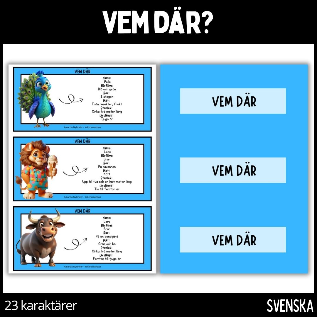 Låt eleverna öva på att skriva / göra personbeskrivningar med hjälp av detta material. Materialet innehåller 23 olika bilder / illustrationer med tillhörande namn, och fakta, perfekta att köra leken vem där med. Materialet är tänkt att ge eleverna möjligheten att fördjupa sina kunskaper och göra dem säkrare på att göra personbeskrivningar, något som gynnar dem vid moment likt berättande text. Materialet tillåter även eleverna att befästa kunskaper om olika slags djur, växter, påhittade figurer. Låt eleverna själva välja bild / illustration och låt dem sedan göra personbeskrivningen enskilt eller tillsammans i par eller grupp, eller låt eleverna köra leken vem där. Ett roligt och lekfullt sätt att lära sig att göra personbeskrivningar på.