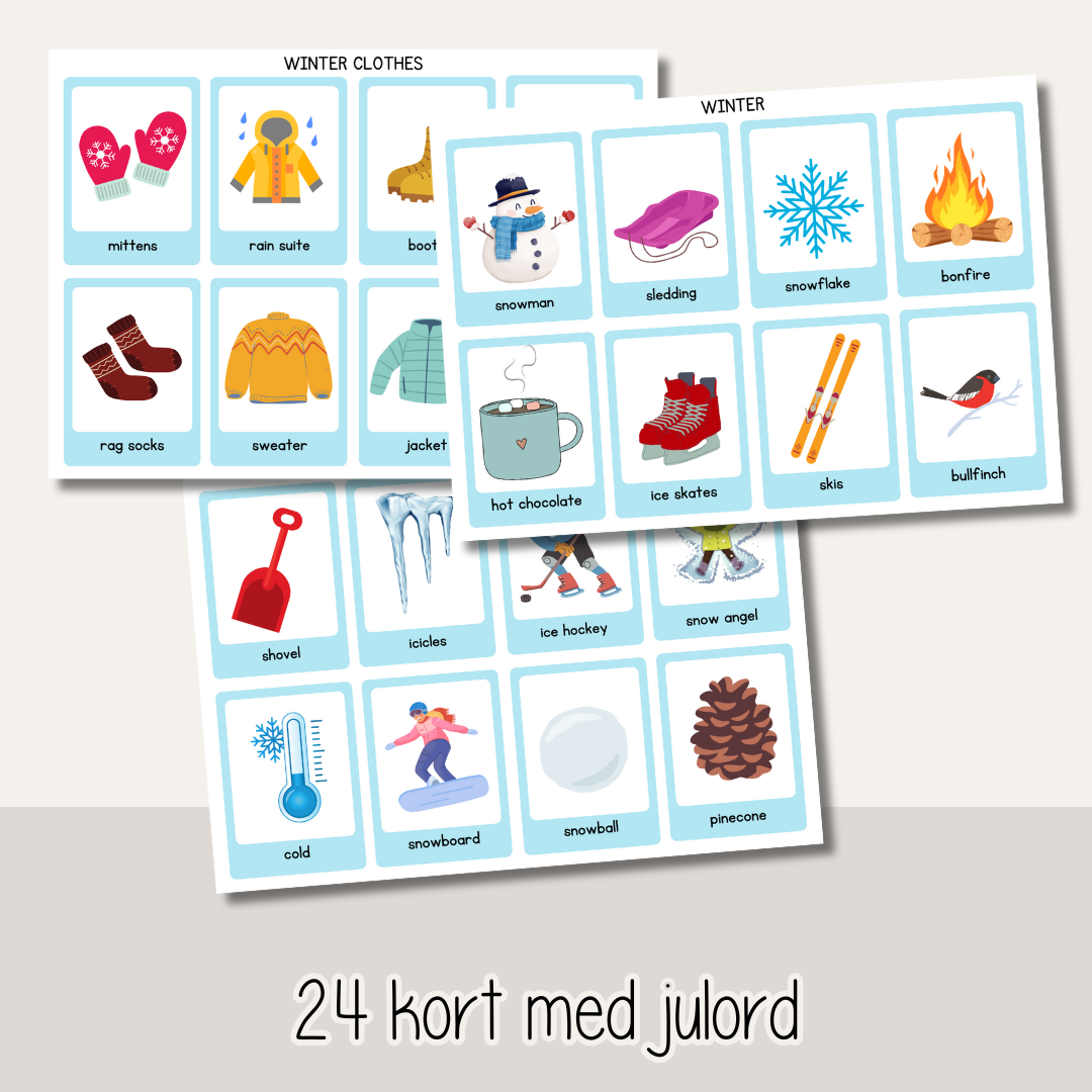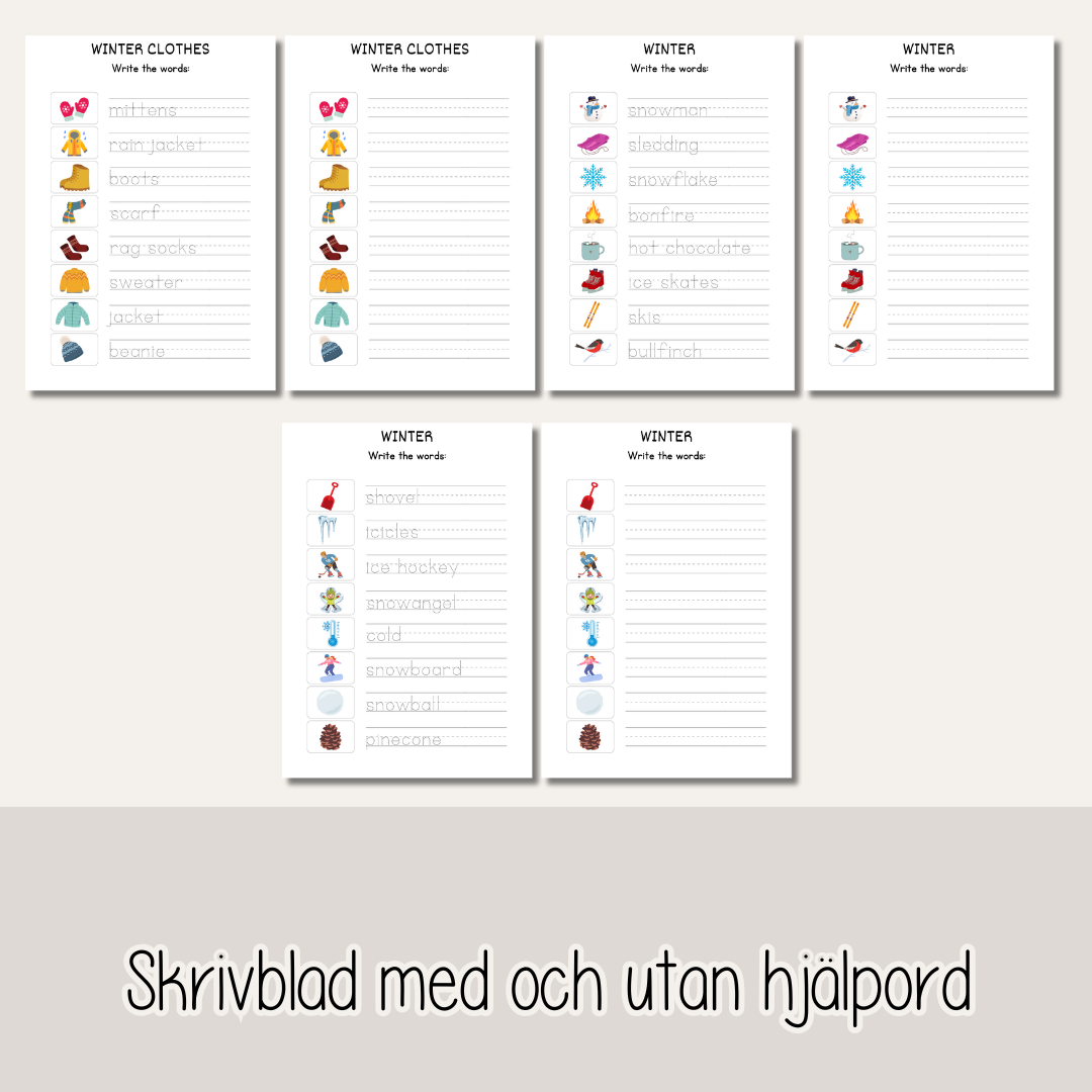 Materielet innehåller 24 flashcards med vinterord på engelska samt skrivblad med och utan hjälpord. Levereras som en PDF-fil.   Materialet ingår i stora glospaketet som finns här.