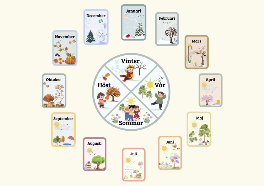 12 kort på årets månader som visuellt presenterar vilken årstid den tillhör. Man kan välja visa ett kort i taget för att presentera vilken månad det är eller använda det tillhörande årstidshjulet och placera månaderna runt.