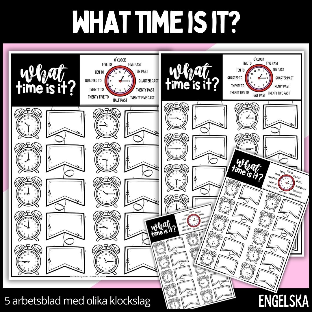 Låt eleverna öva på klockan på engelska, på ett roligt sätt, med hjälp av dessa arbetsblad, i grupp, par eller ensamma. Materialpaketet innehåller 5 arbetsblad med olika klockslag, samt en stödstruktur som eleverna kan ta hjälp av när de ska lista ut vad klockan är.