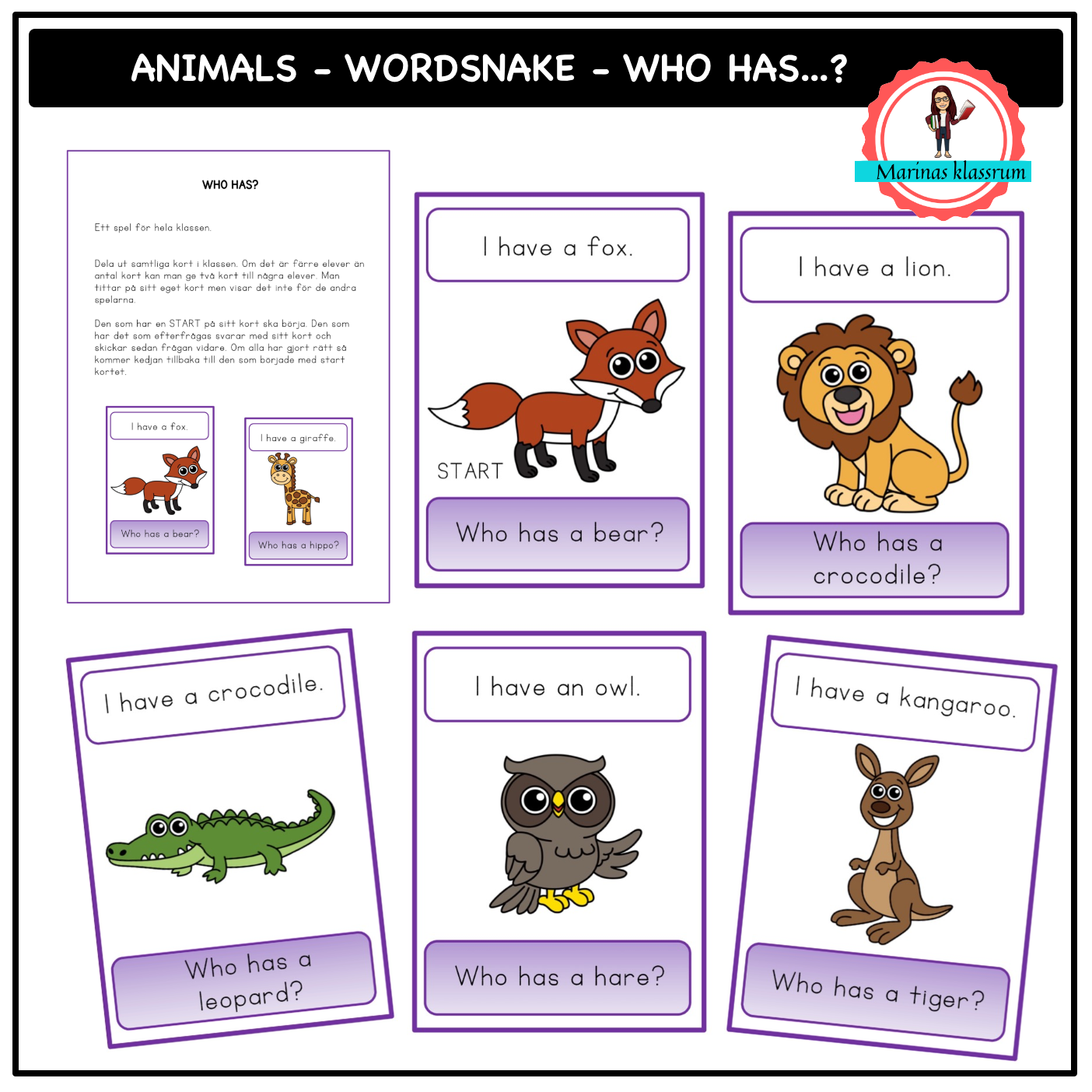 En ordkedja som tränar olika djur. Materialet innehåller två olika versioner en med 20 kort och en med 30 kort.