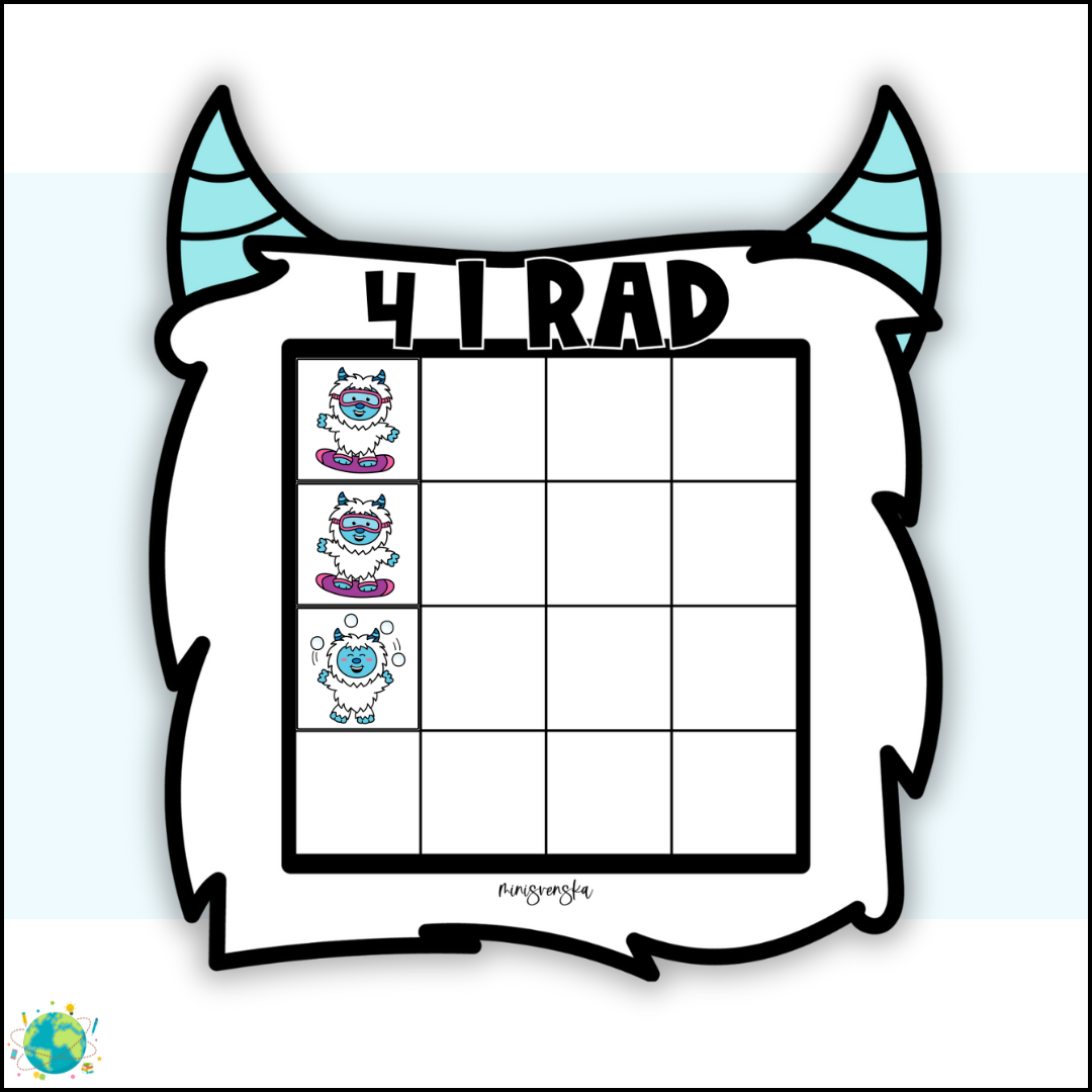 🎲 4 i rad – Yeti Ett klassiskt 4 i rad-spel i Yeti-tema. Eleverna tränar strategi, logiskt tänkande och samarbete. Ett uppskattat spel som fungerar lika bra i undervisning som på fritids. ✔️ Tränar strategi och turtagning ✔️ Enkelt att använda ✔️ Passar för förskola, F–åk 3 & fritids ✔️ PDF